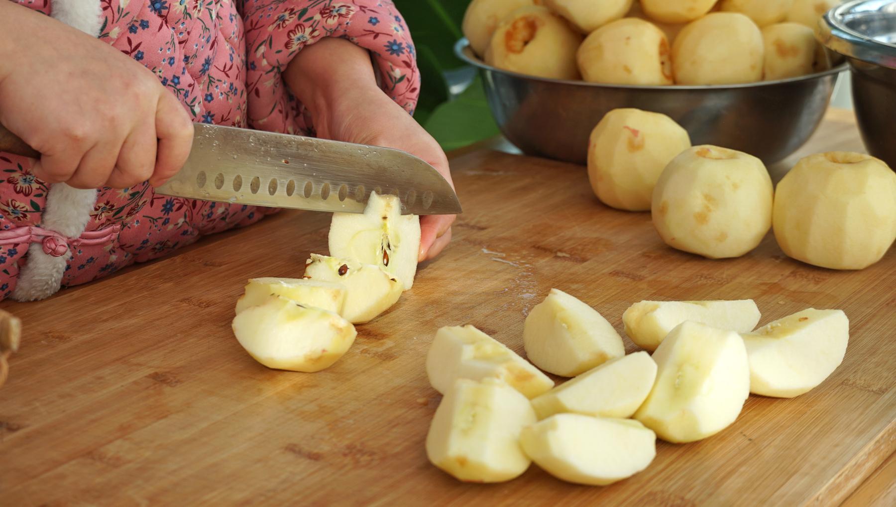 2、蘋果乾想要好喫,切的時候就要切大塊一點,喫起來口感更有肉感,不至於太硬。