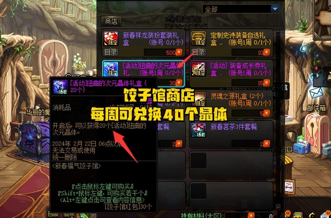 在新春福氣餃子館中,原本每週可用20個紅包換6個次元晶體;現在可用30個紅包換40個次元晶體。