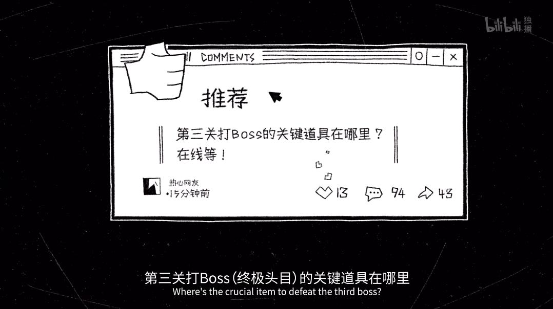 《瓶裝閃電》中有這樣一個情節,主人公阿生開發的遊戲收到諸多差評,他也隨之心灰意冷,進而遭到最終Boss的精神控制。就在萬念俱灰之際,他的腦海中閃過一條消息,是一位玩家向他諮詢打敗終極Boss的關鍵道具在哪。