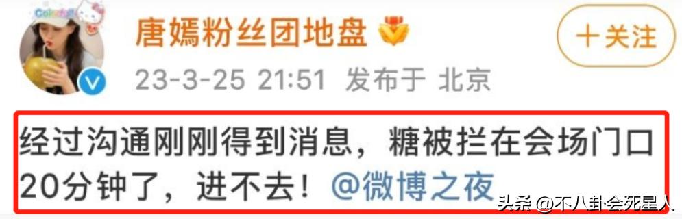 而去年的微博之夜上,誰還記得唐嫣因爲遲到被攔在會場門口20分鐘,最後連微博之夜的內場都進不去。