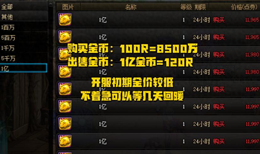 購買金幣比例:100R入手8500萬;出售金幣比例(拍賣行郵寄):1億等於120R!