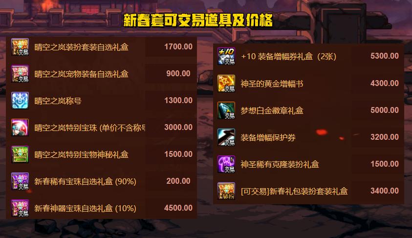 “+10增幅券禮盒(2張)”5300萬;“夢想白金徽章”4300萬;“裝備增幅保護券”3200萬;“稀有克隆裝扮(1部位)”1500萬;“永久新春時裝”3400萬!