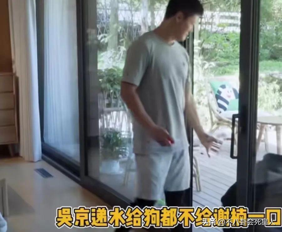 以及看到謝楠蹲下來在忙,吳京拿着水過來,謝楠起身以爲是給自己的,結果吳京指了指遠處的狗,他把水給狗喝,也不給老婆。