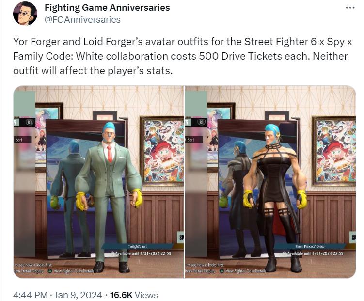 《街霸6》與劇場版動畫《間諜過家家CODE: White》的聯動就沒逃過網友的審判——按照原作的設定,福傑夫婦優雅外表下各個身份不凡,有着驚人的功夫,彈指間撂倒一片。其中約爾太太更是經典怪力女,二位看上去和《街霸6》衆人畫風還挺搭。