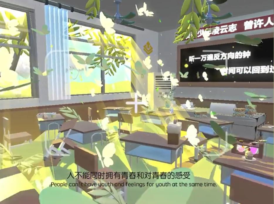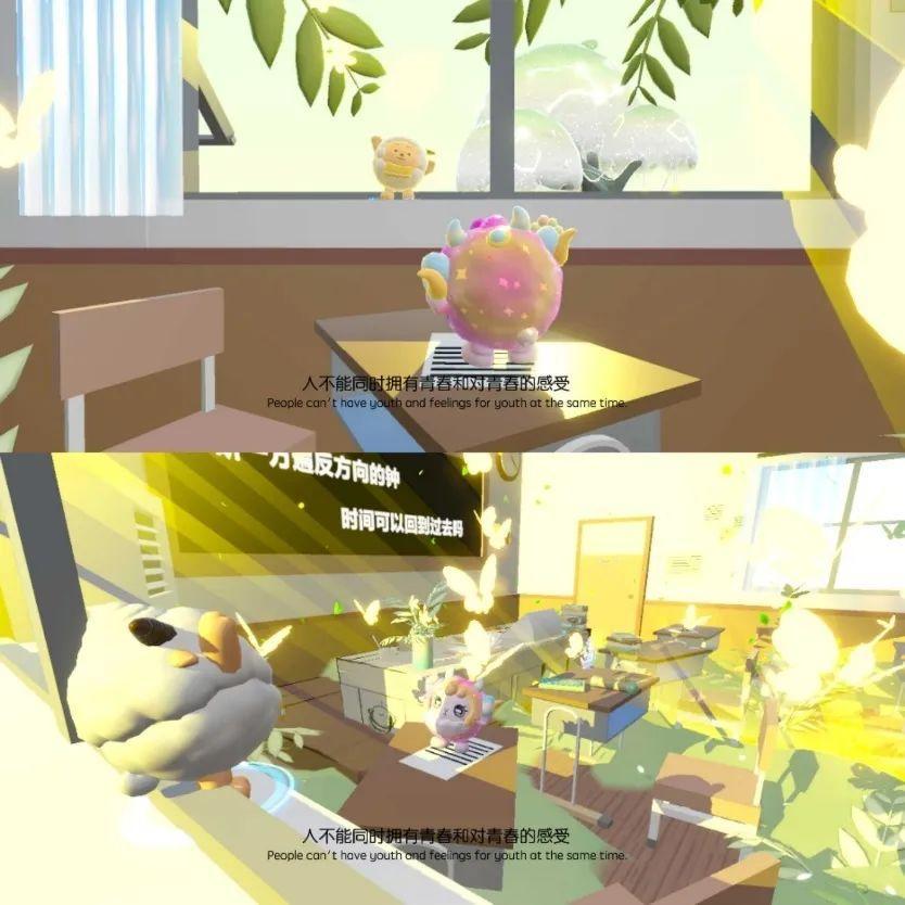 生活中的日常場景同樣擁有“美”的力量,甚至可能更加觸動人心。在《握不住的盛夏》中,蛋仔回到被陽光灑滿的教室,桌椅凌亂,時間定格,只有微小的光塵和簌簌飄落的綠葉依舊飛舞。