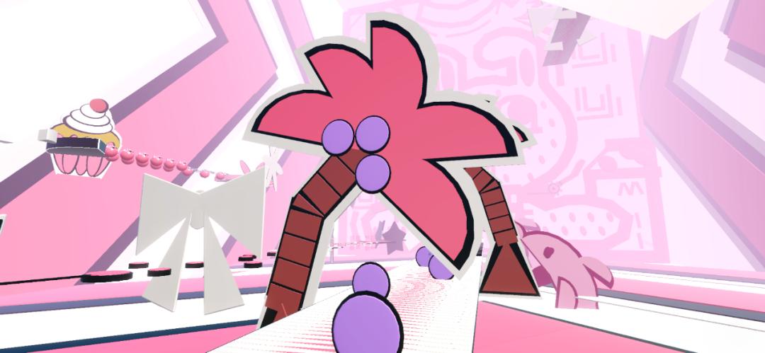 《蛋仔派對》是一款很難定義具體玩法的產品,蛋仔玩家對美的感受同樣不受限制。在《心碎貼畫》中,整張地圖都是粉色系的貼紙風格,紫色的椰子從搖晃的椰子樹上掙脫,海豚躍起又落下,草莓蛋糕隨着你蹦跳的節奏律動搖晃。