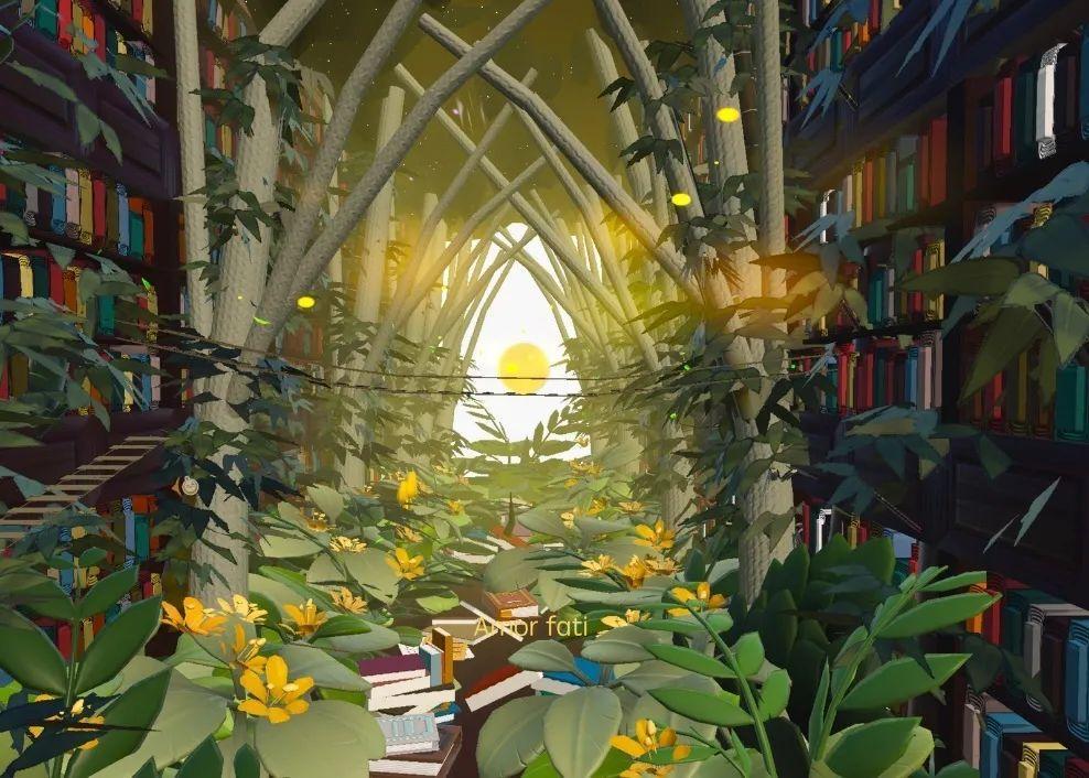 順着藤蔓一路前行,直到風翻起書本,將零散的書頁在空中鋪成一條小路。抽出羽毛筆,羽毛筆也打着旋兒指引你向前……