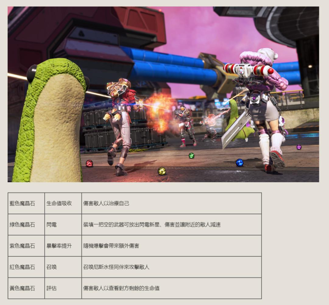 此外還有魔晶石,作爲武器配件刷新在地圖上。每種魔晶石都會爲武器附加特殊的效果,比如吸血、釋放暴擊、召喚獸等等,供玩家們把FPS玩成RPG。
