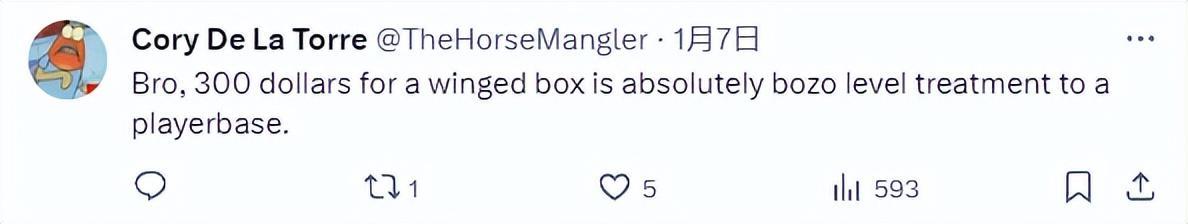 就連一位前重生員工也看不下去了,發推表示:“花300刀買個帶翅膀的盒子,這絕對是在把玩家當成傻瓜對待。”