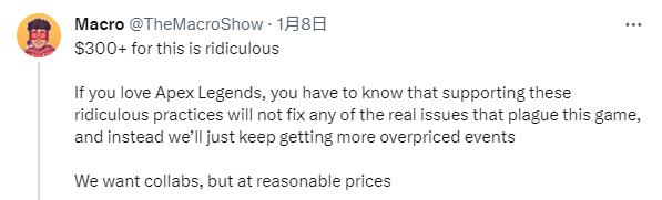 這次聯動因此成爲了Apex歷史上最貴的一次收集活動。戰利品包定價一曝光,便立即激起了Apex玩家社區的不滿。一想到Apex這遊戲屬於經常在遊戲貨幣化問題上出事的EA,玩家們也不願再嘴上留情。