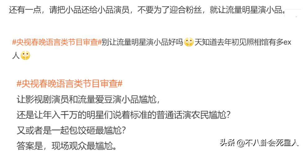 就拿今年的央視春晚彩排名單來說吧,語言類節目除了賈冰,馬旭東,蔣詩萌,像沙溢就是影視演員,章若楠,白鴿這些都是“流量明星”。
