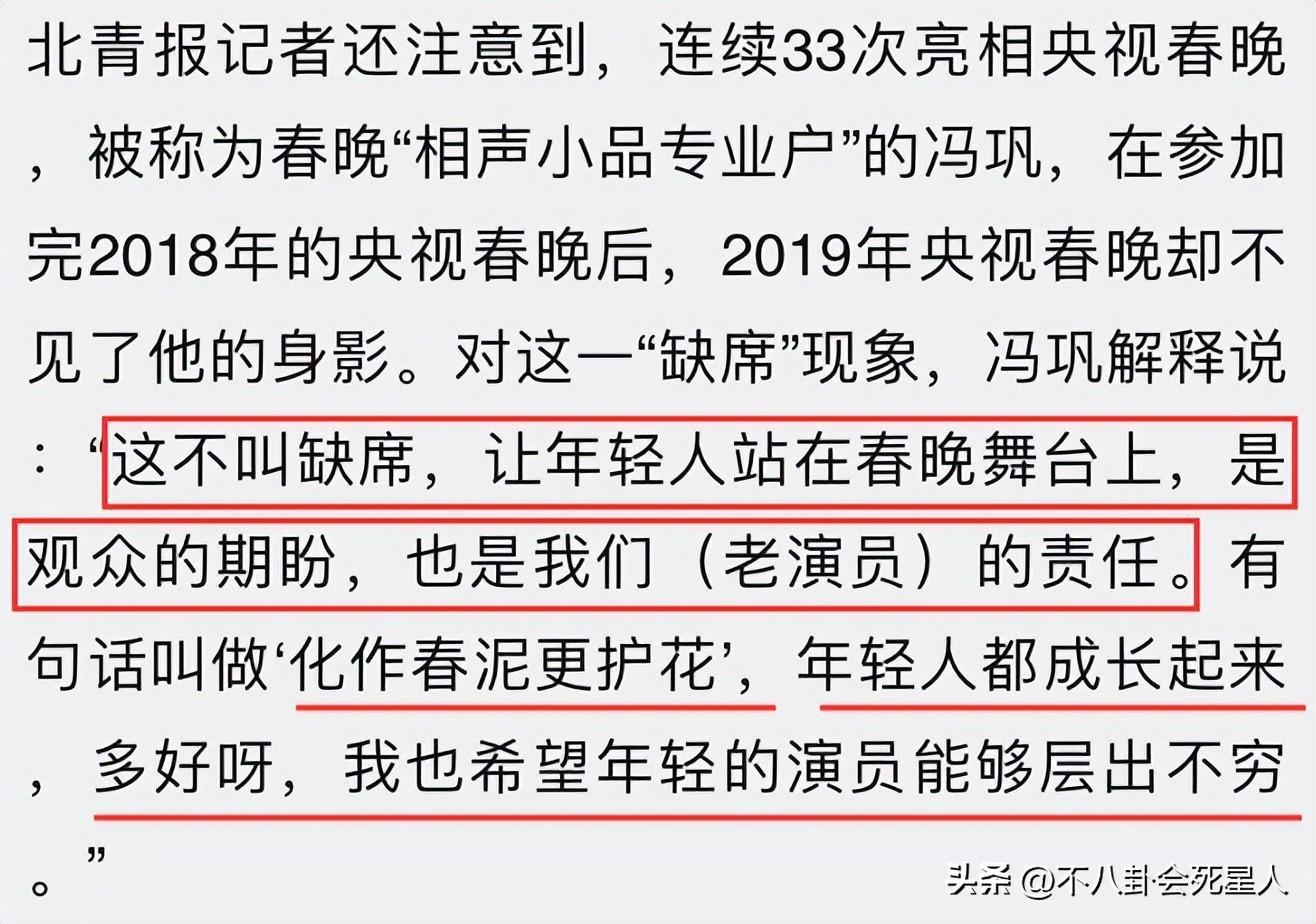 但2019年之後,馮鞏便“退出”了央視春晚,他給出的回應是,覺得自己不上央視春晚不是缺席,而是把更多的機會留給年輕人。