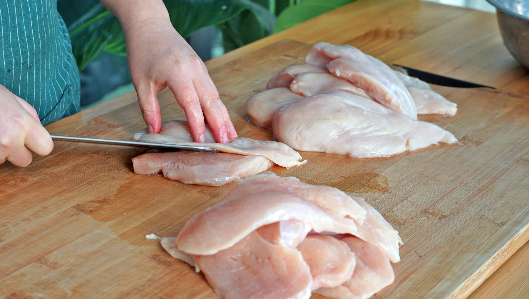 2、雞胸肉是比較厚的,先一分爲二切成薄一點的兩大片肉。