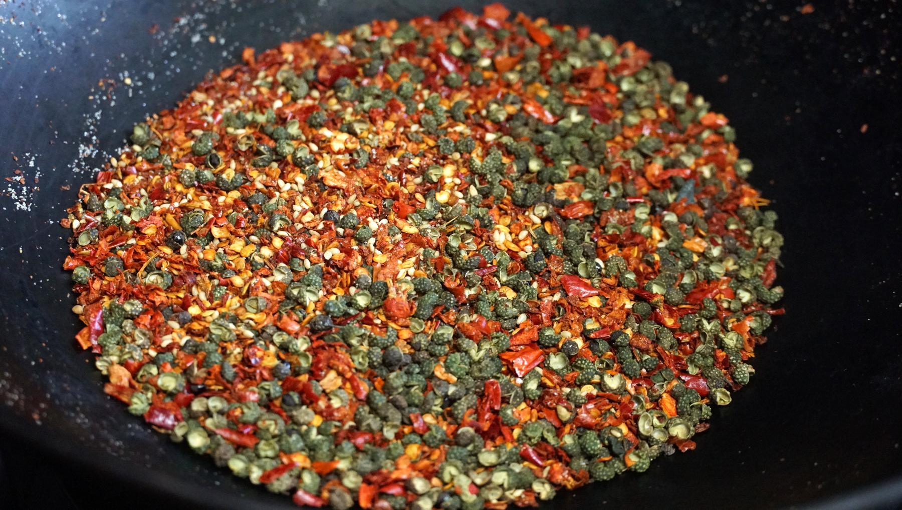 1、這時間來炒調料,鍋裏不用放油,加鹽20克、花椒30克、白芝麻20克、辣椒麪60克,小火慢慢炒,花椒炒香後就可以關火倒出來。
