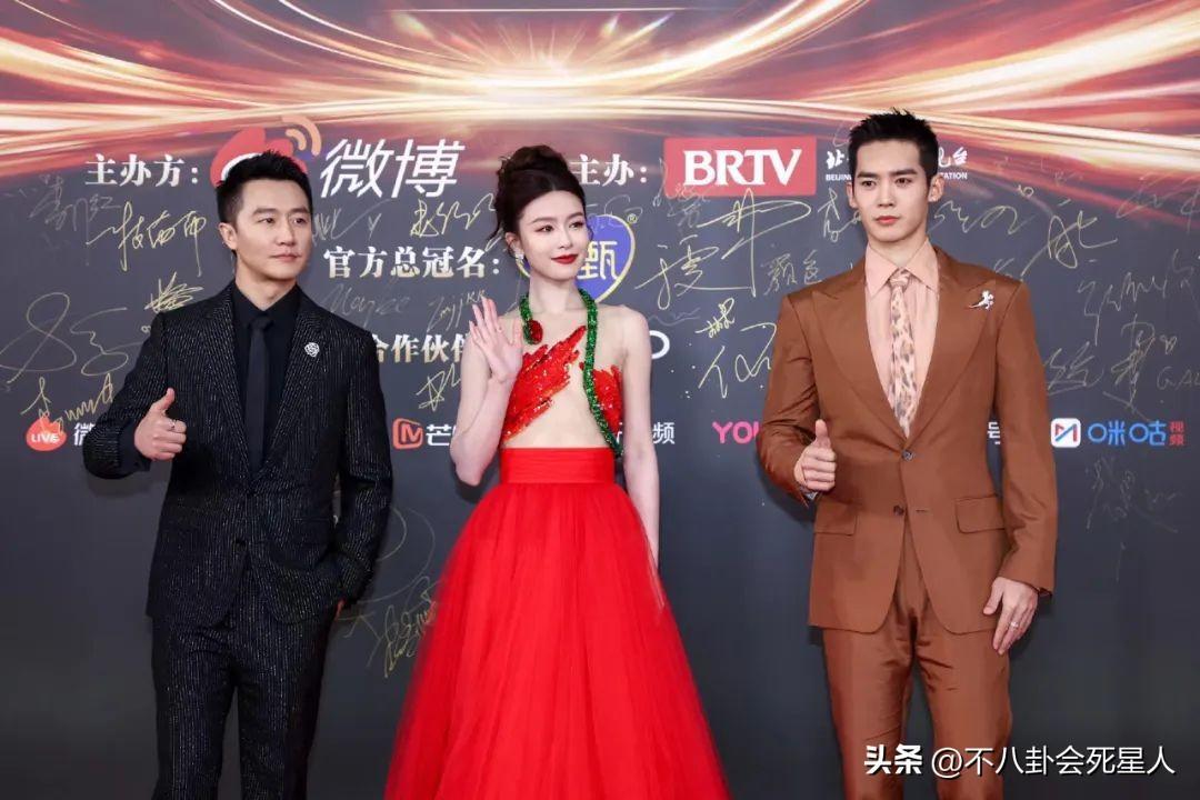 文詠珊身穿紅色薄紗透視禮服,美豔動人,她和黃軒、於適一塊走紅毯。黃軒身穿黑色西裝,很有大哥的風範,於適短髮配棕色西裝,盡顯幹練,三位同框是一場視覺盛宴。