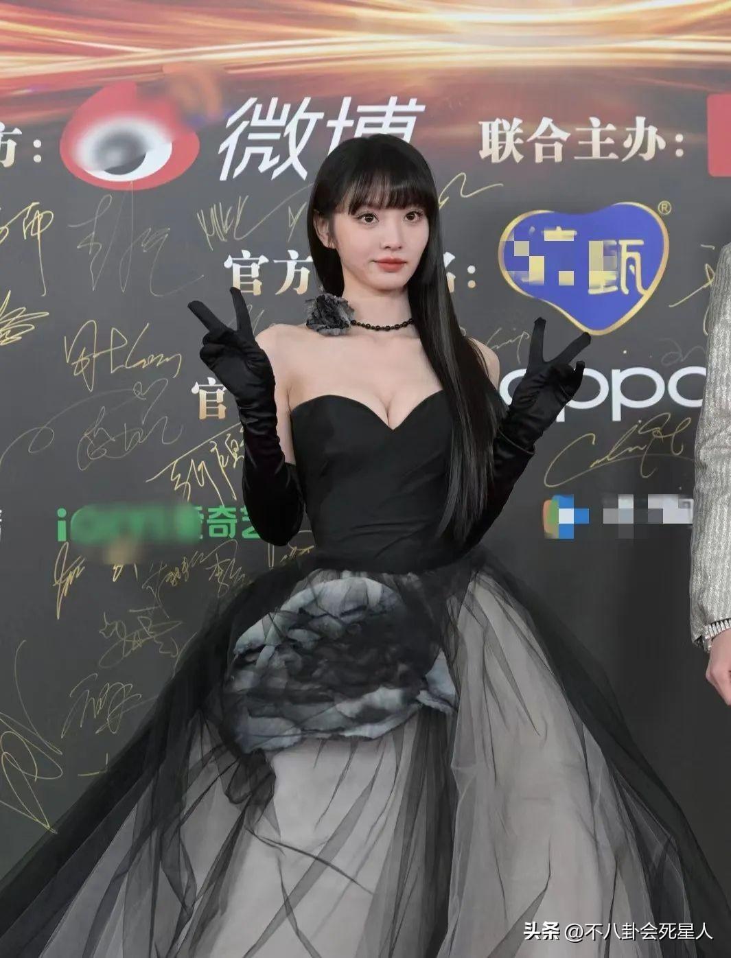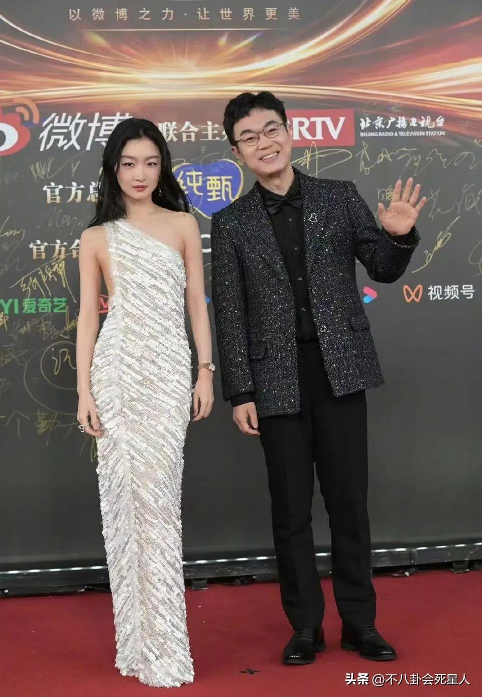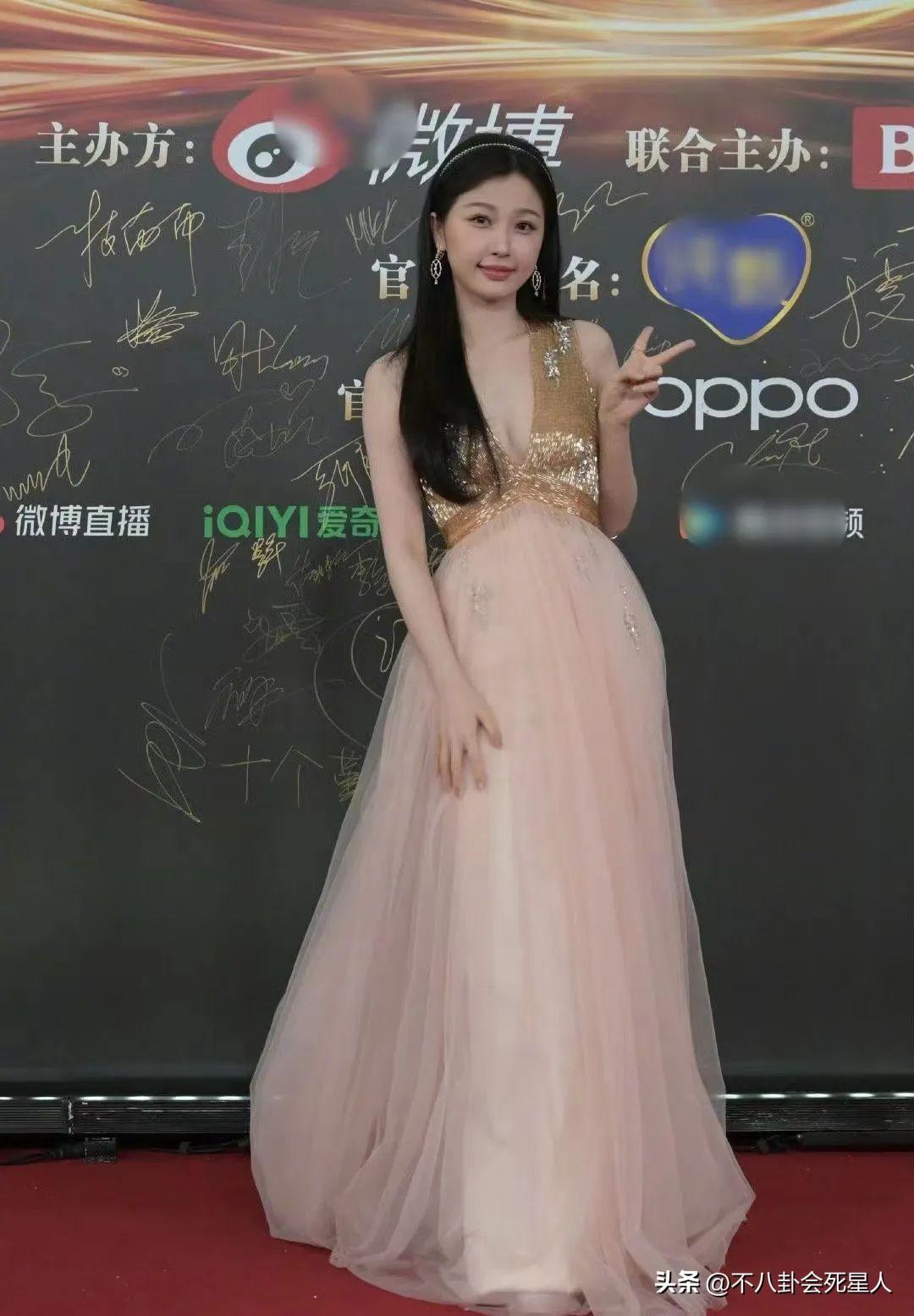 周也穿着銀色深V禮服,她的四肢纖細,禮服又太大,需要多次往上提,都瘦成“大頭娃娃”了。
