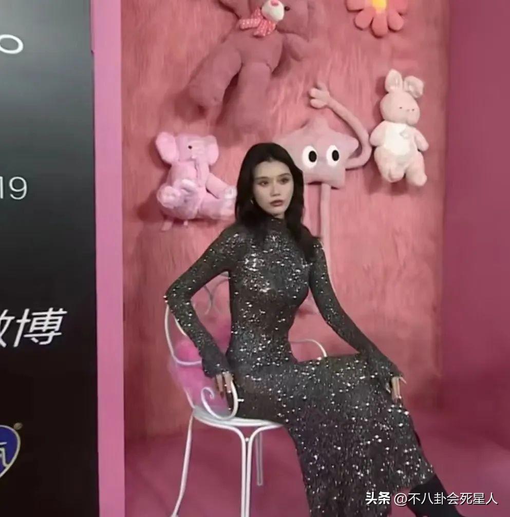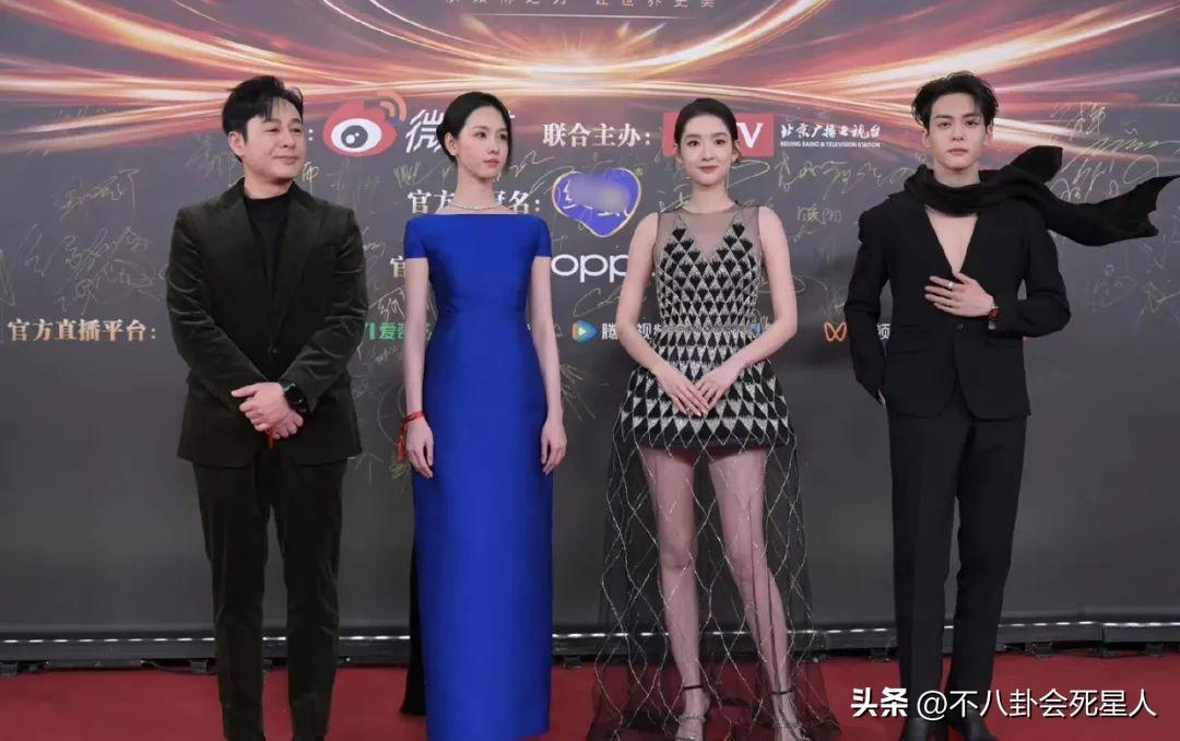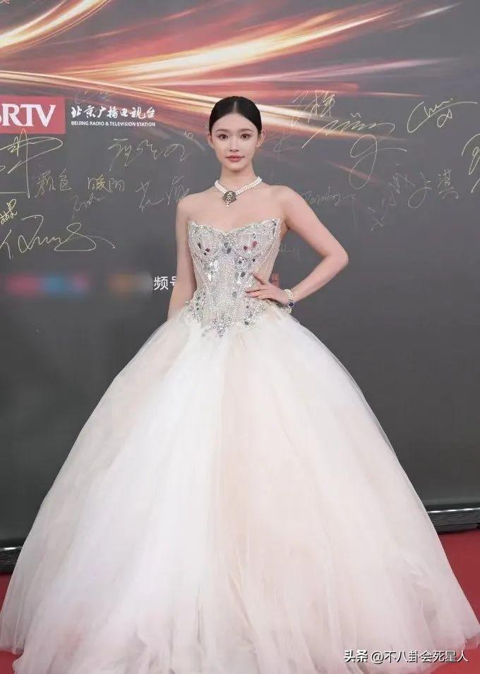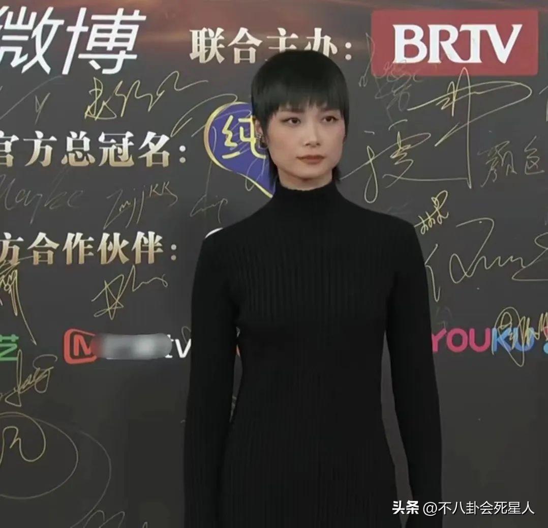 周也穿着銀色深V禮服,她的四肢纖細,禮服又太大,需要多次往上提,都瘦成“大頭娃娃”了。