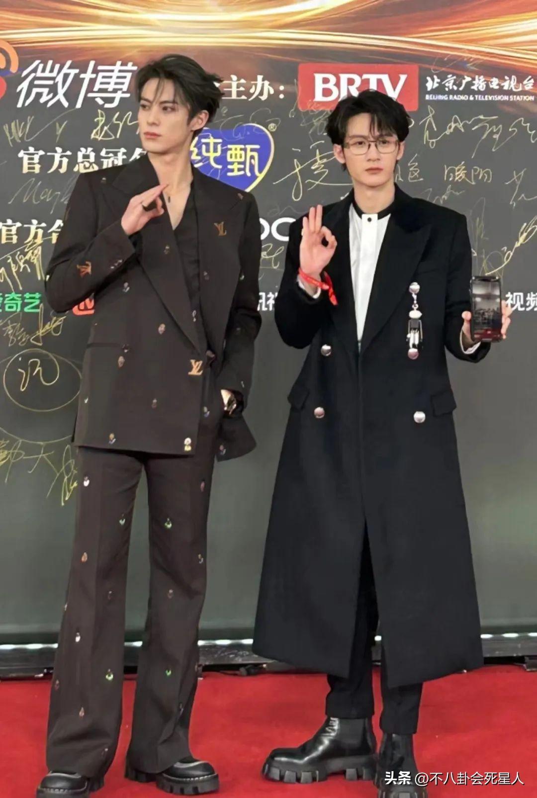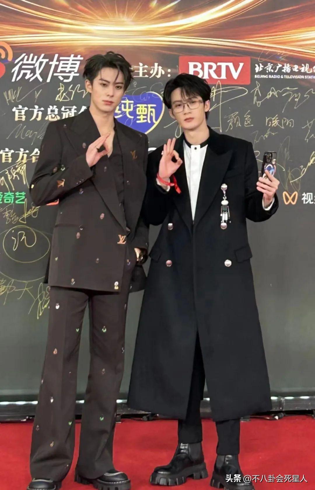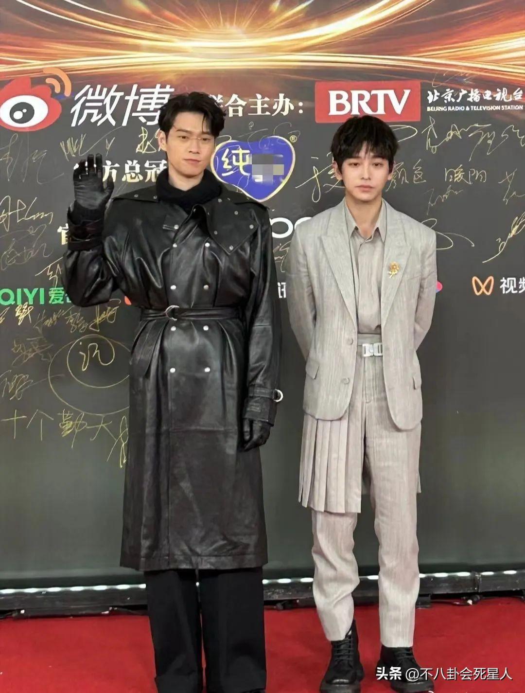 魏大勳也是如此,沒和秦嵐一塊走紅毯,而是和彭昱暢一起,魏大勳的皮衣造型有點冷酷,彭昱暢的淺色服裝則比較呆萌。