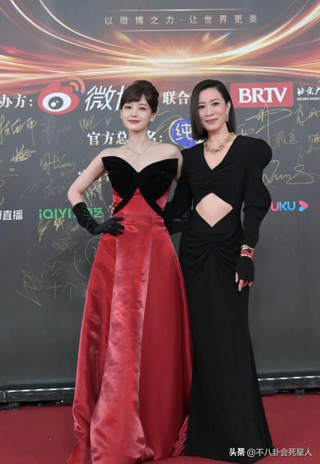 李一桐的造型是赫本風,劉海盤發搭配黑紅抹胸禮服,有種女王的感覺。佘詩曼一如既往留短髮,黑色露肚裙性感又有設計感,二人同框比心,美得各有特色。