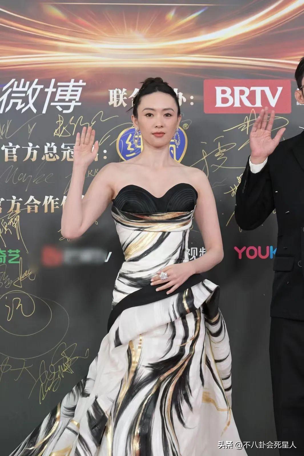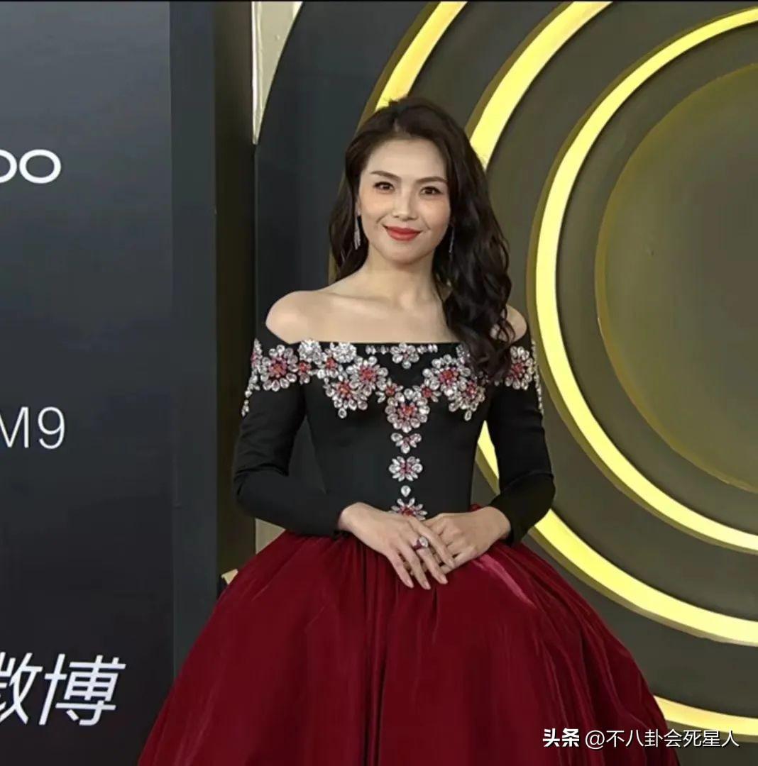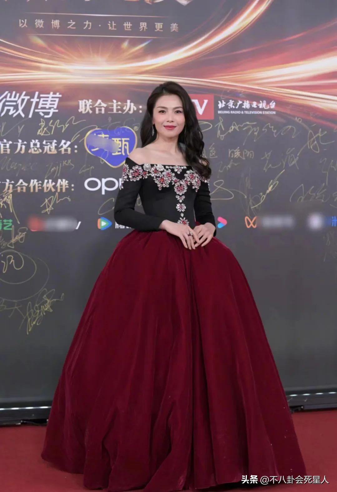 同樣造型一言難盡的,還有劉濤,穿着一字肩帶花禮服,上半身的圖案顯得土氣,下半身的紅裙顏色太暗,也不出衆。