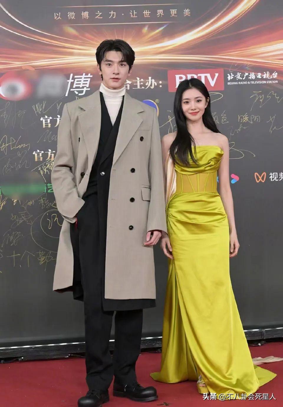 林一和劉浩存合作了《脫軌》,這部劇播出後二人的熱度提升,他們一起走紅毯,林一穿着高領毛衣配駝色大衣,造型帥氣,劉浩存的禮服就有些一言難盡了,熒光色顯黑,真是選錯禮服了。