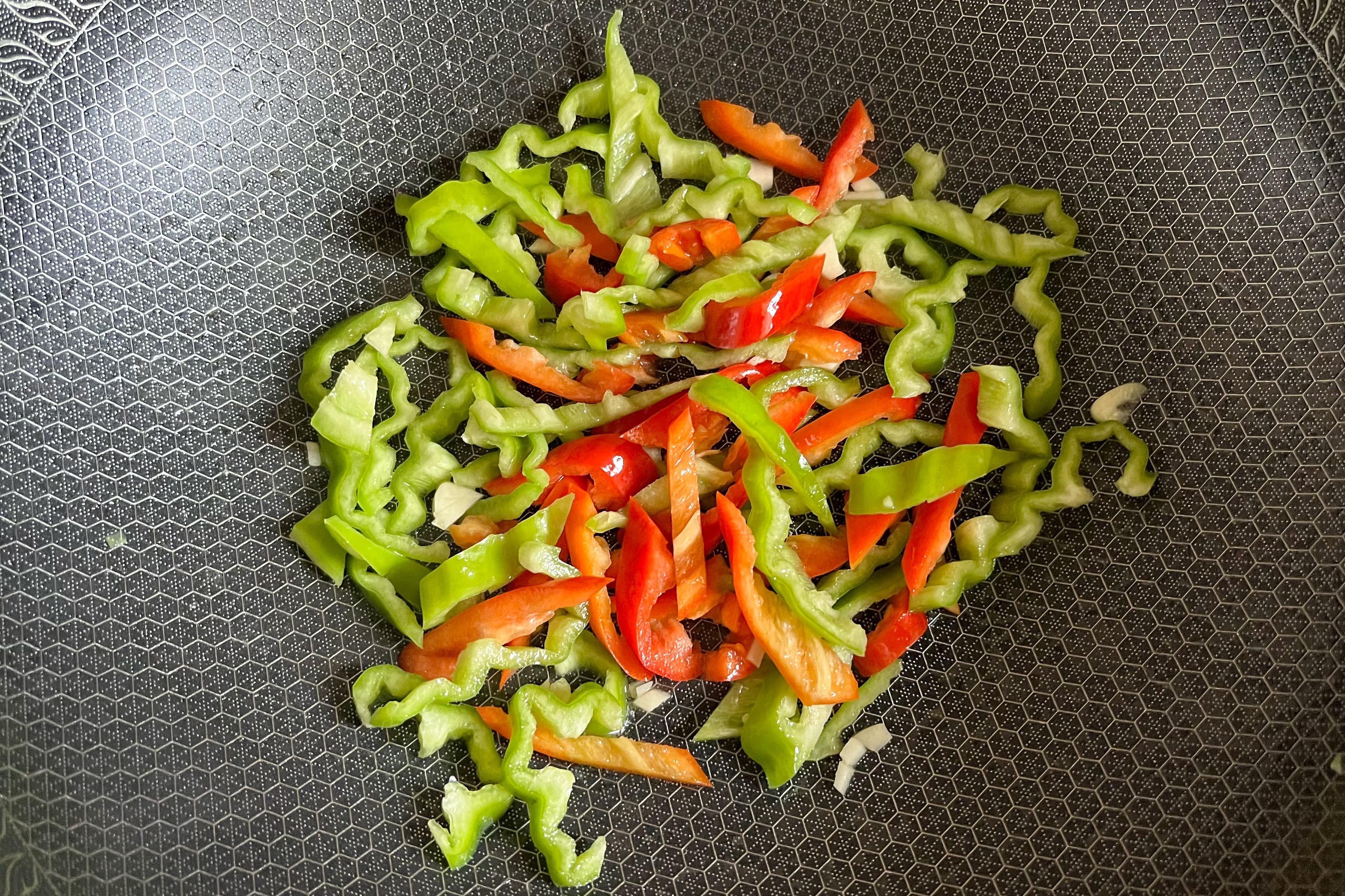 2、尖椒切細絲狀,下油鍋中,不斷煸炒至斷生;