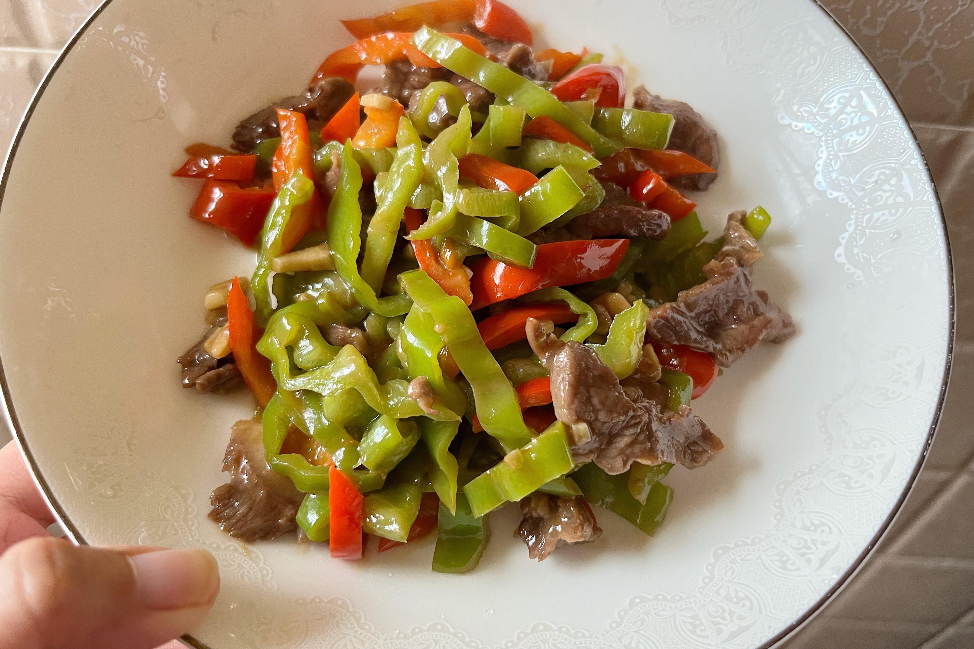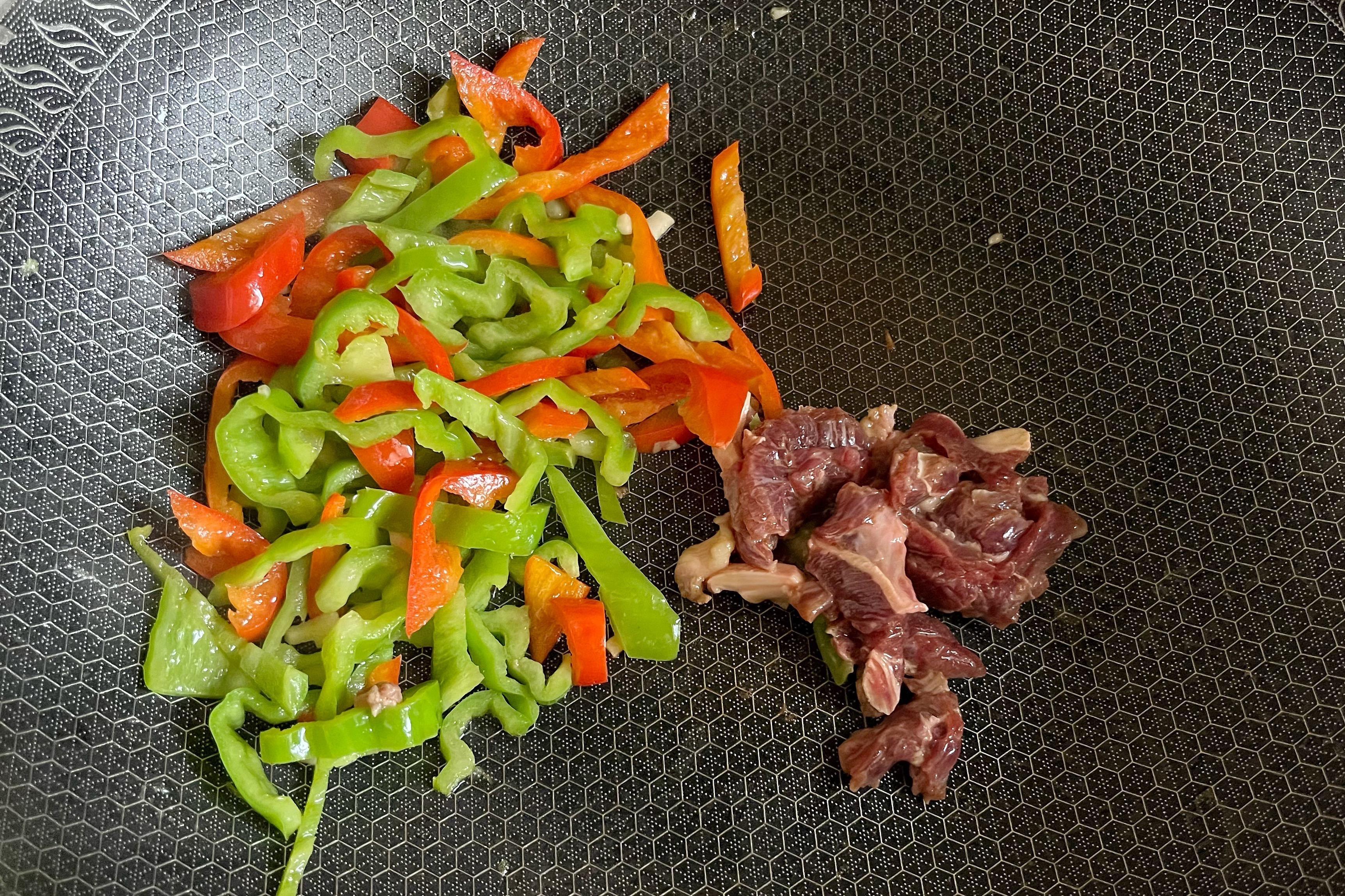 3、下牛肉,大火翻炒3分鐘左右,炒至牛肉熟軟;