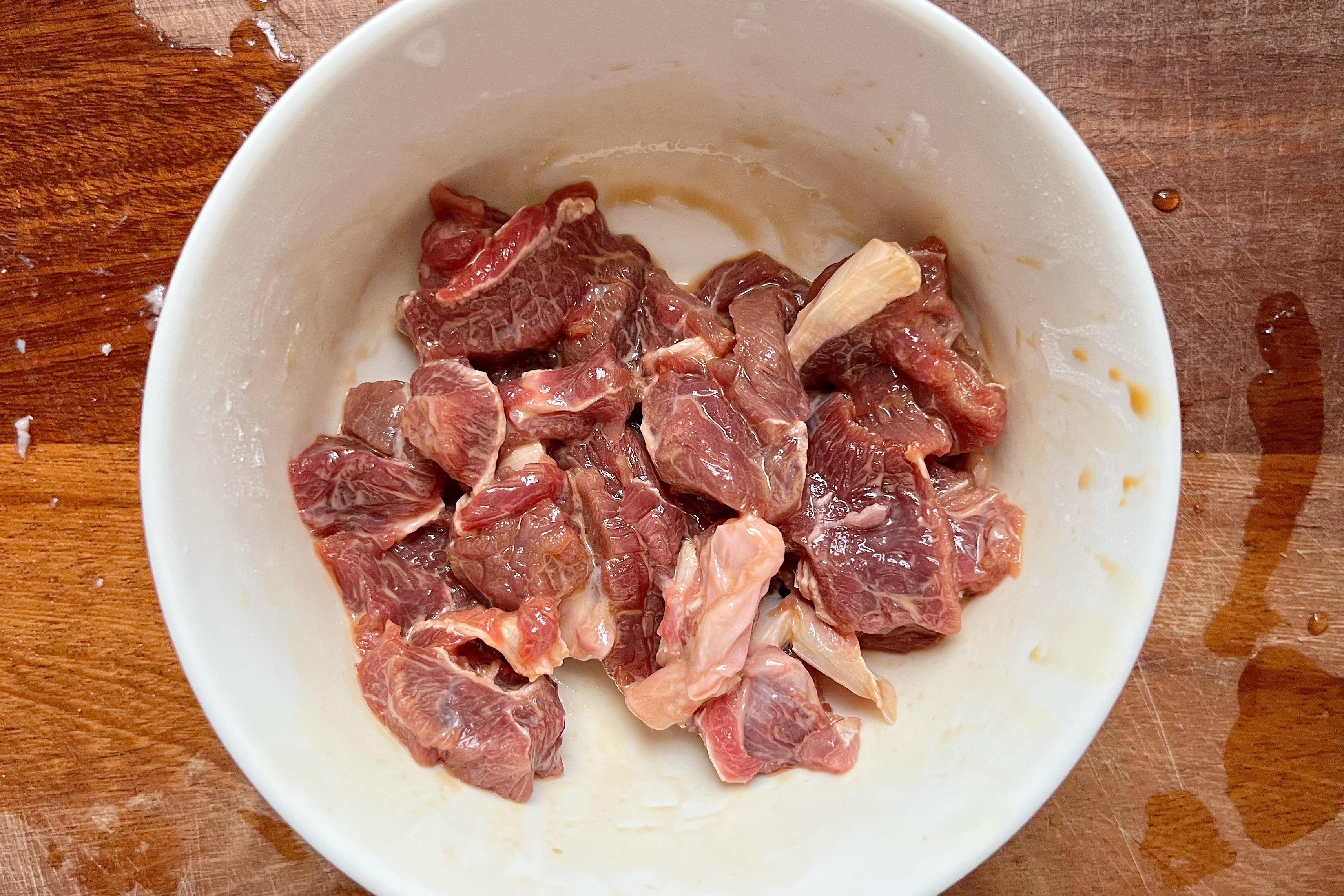 1、準備些瘦牛肉切薄片,然後加些料酒、生抽、生粉,抓勻醃製15分鐘;