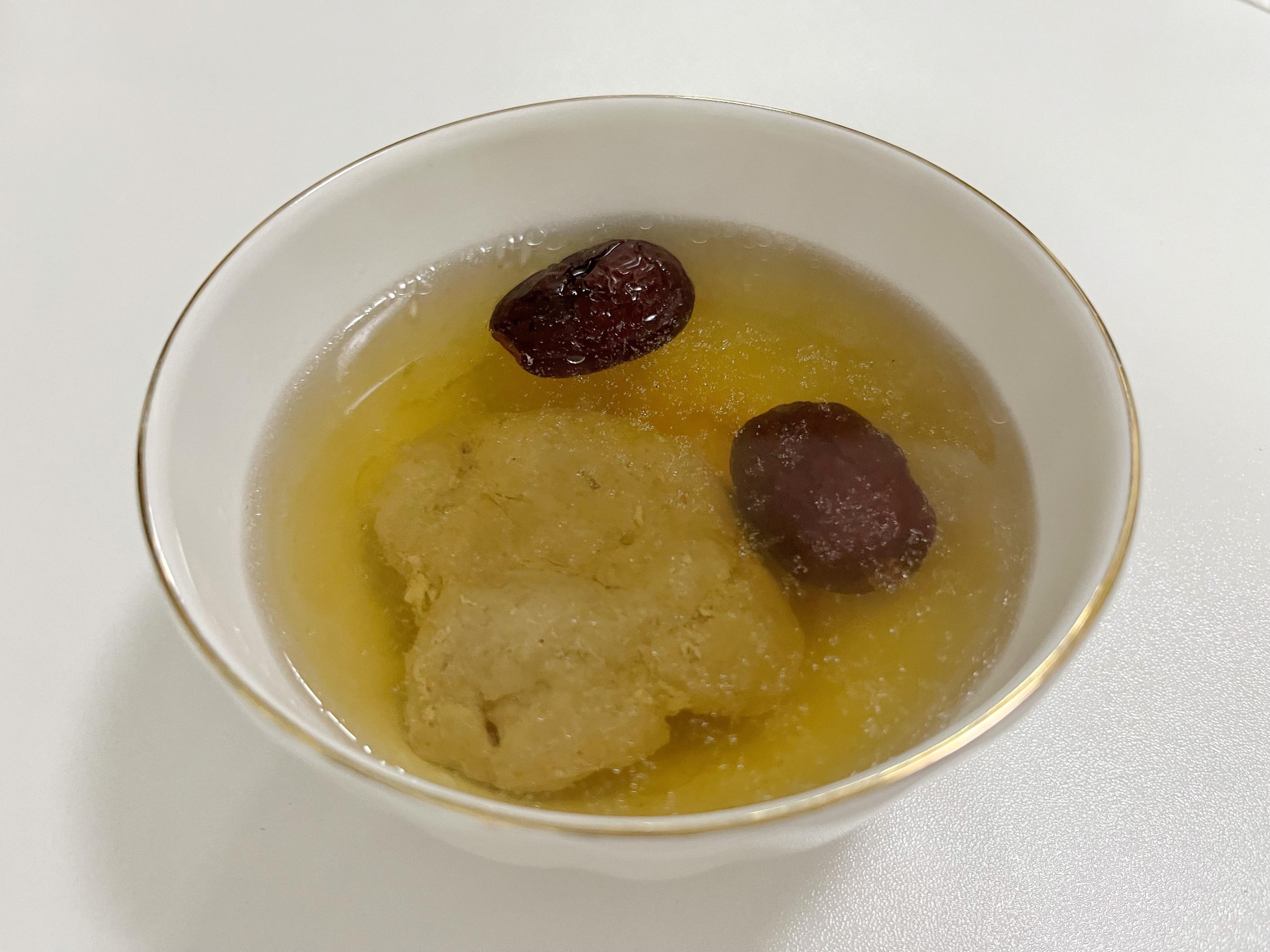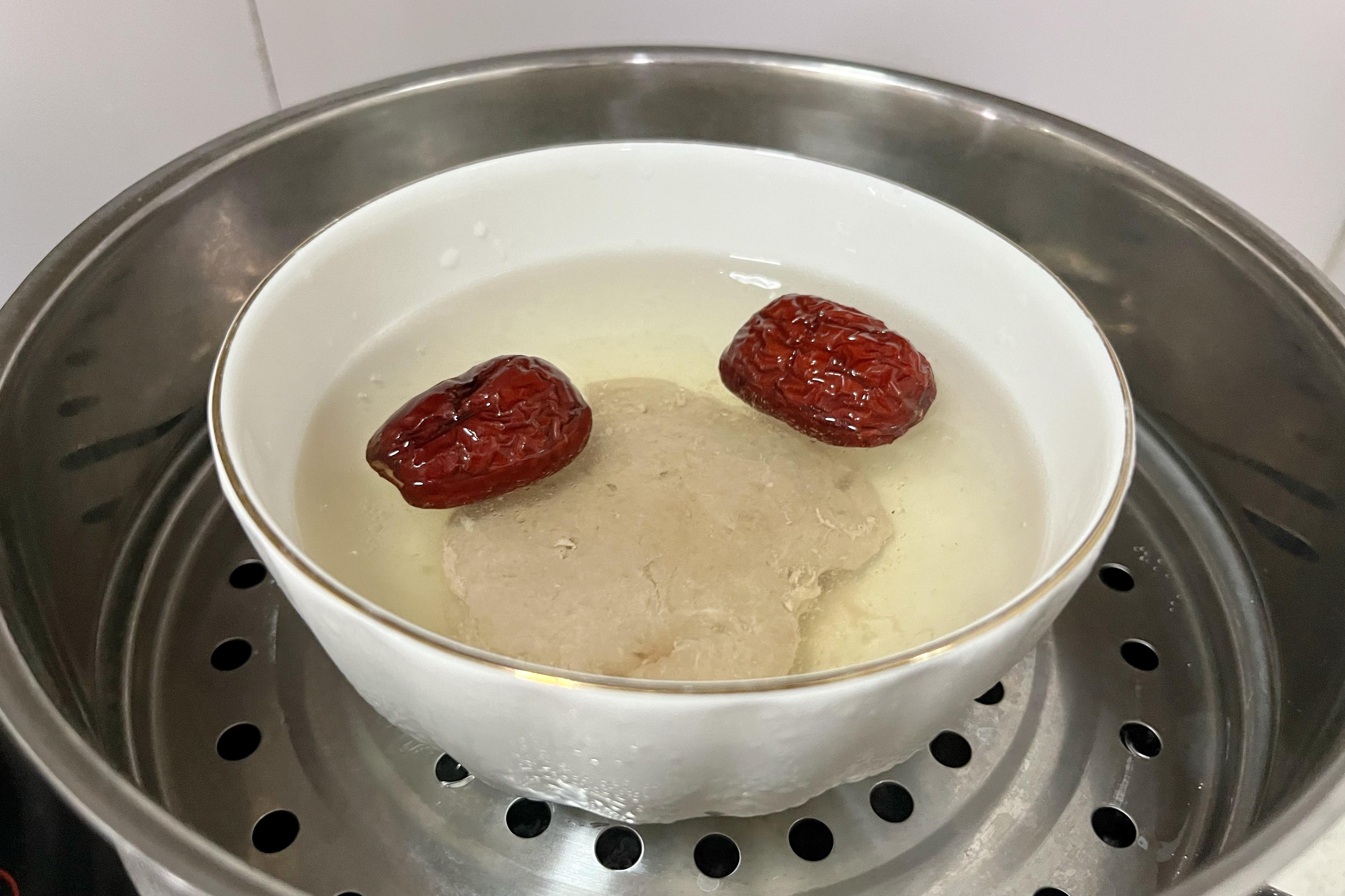 4、隔水蒸至肉變色後,加適量熱開水,再放入紅棗、少許食鹽;