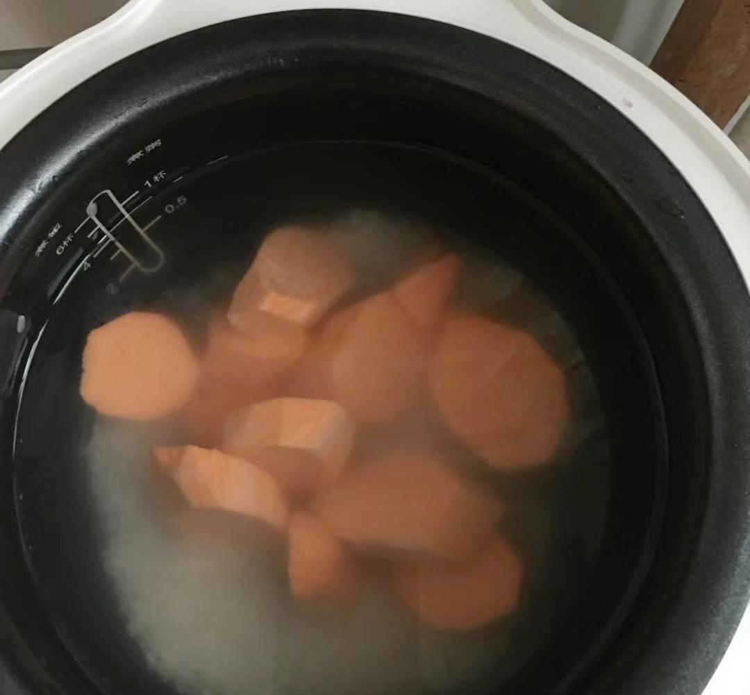 3、大火煮開後,轉小火煮30分鐘,煮至紅薯變軟爛,即可享用。