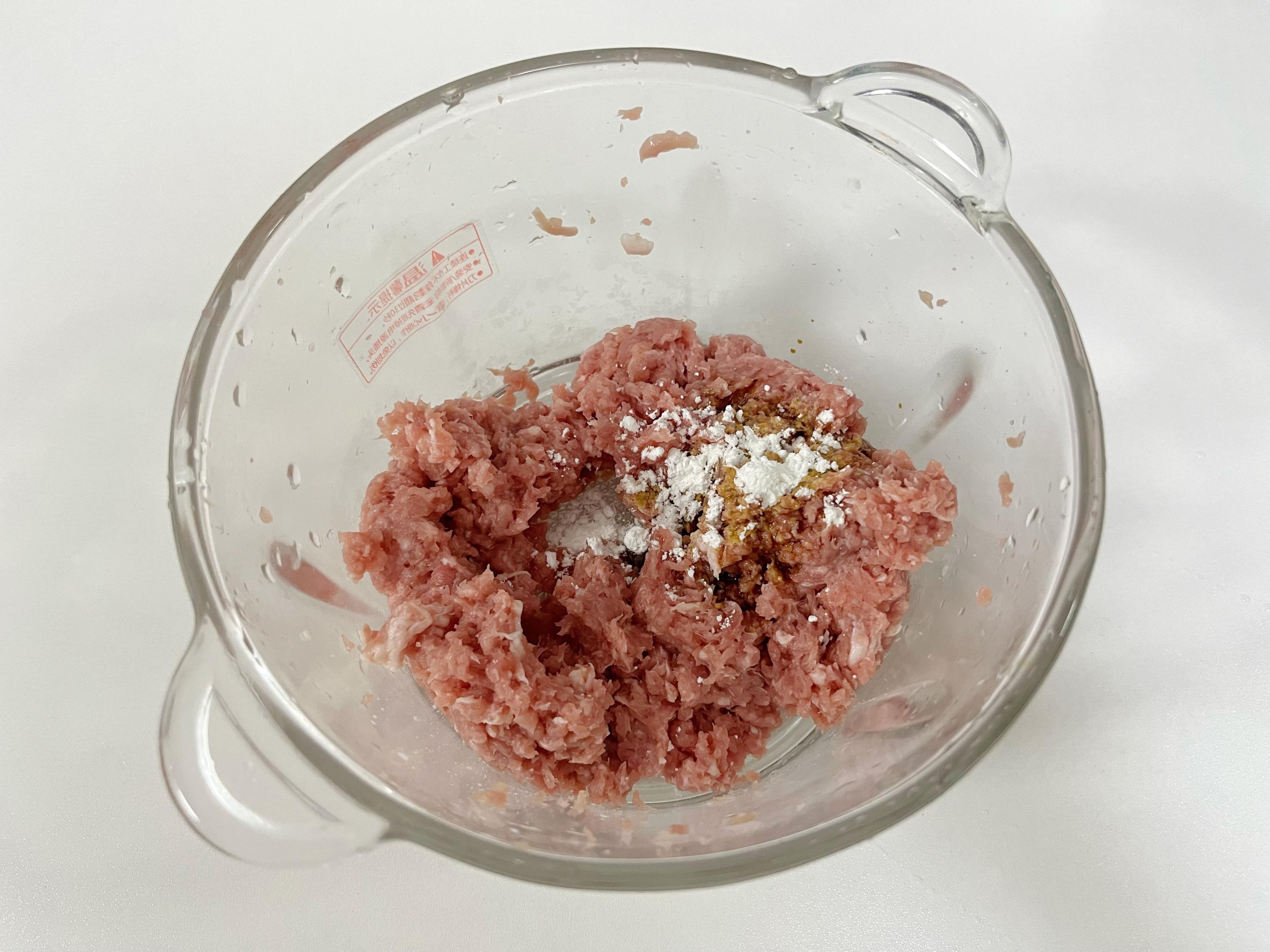 2、往肉餡中加些生抽、生粉,順着一個方向攪拌至上勁;