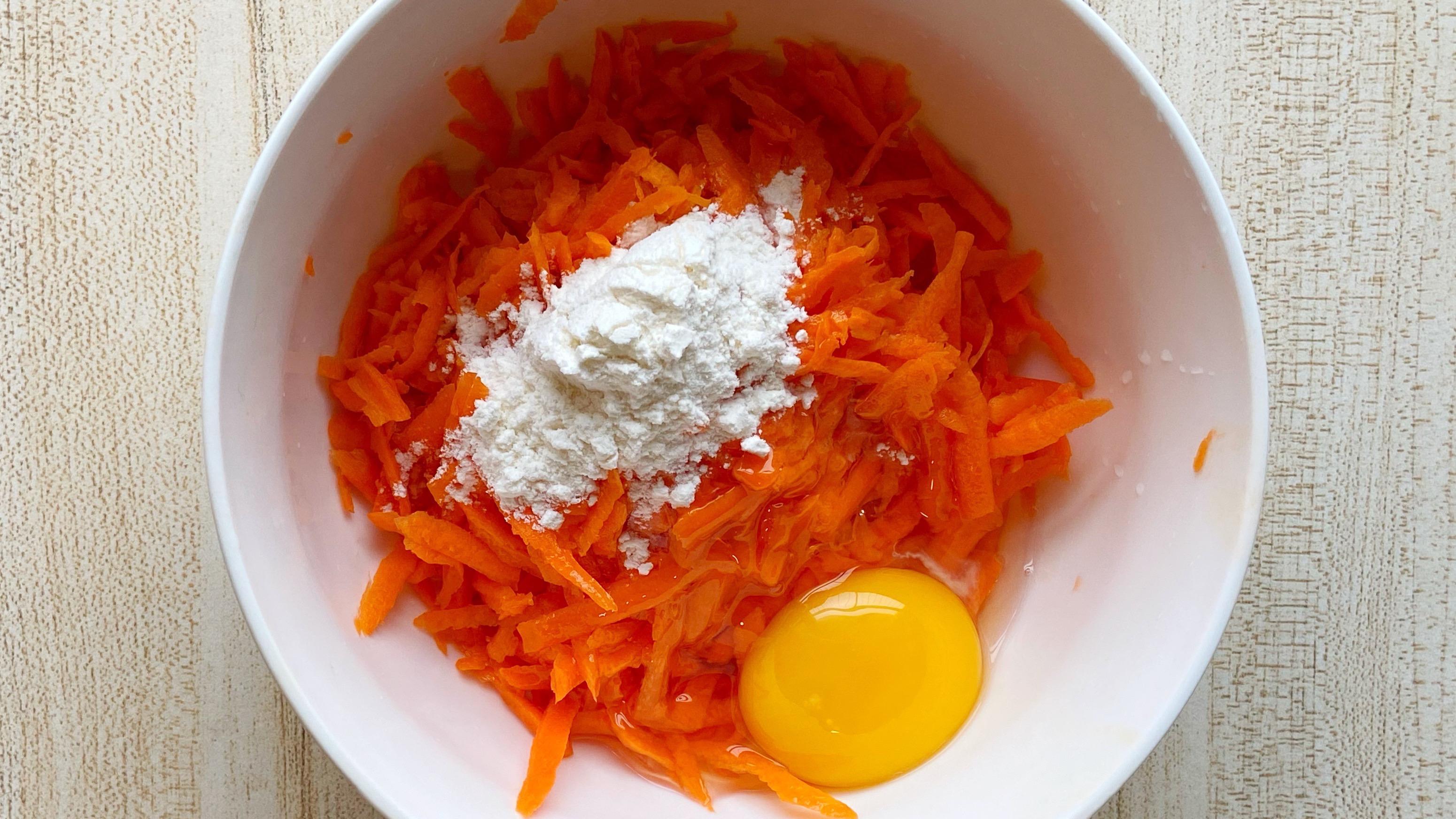 1、準備半根胡蘿蔔,去皮擦絲後,再敲入1個雞蛋、加1勺麪粉;