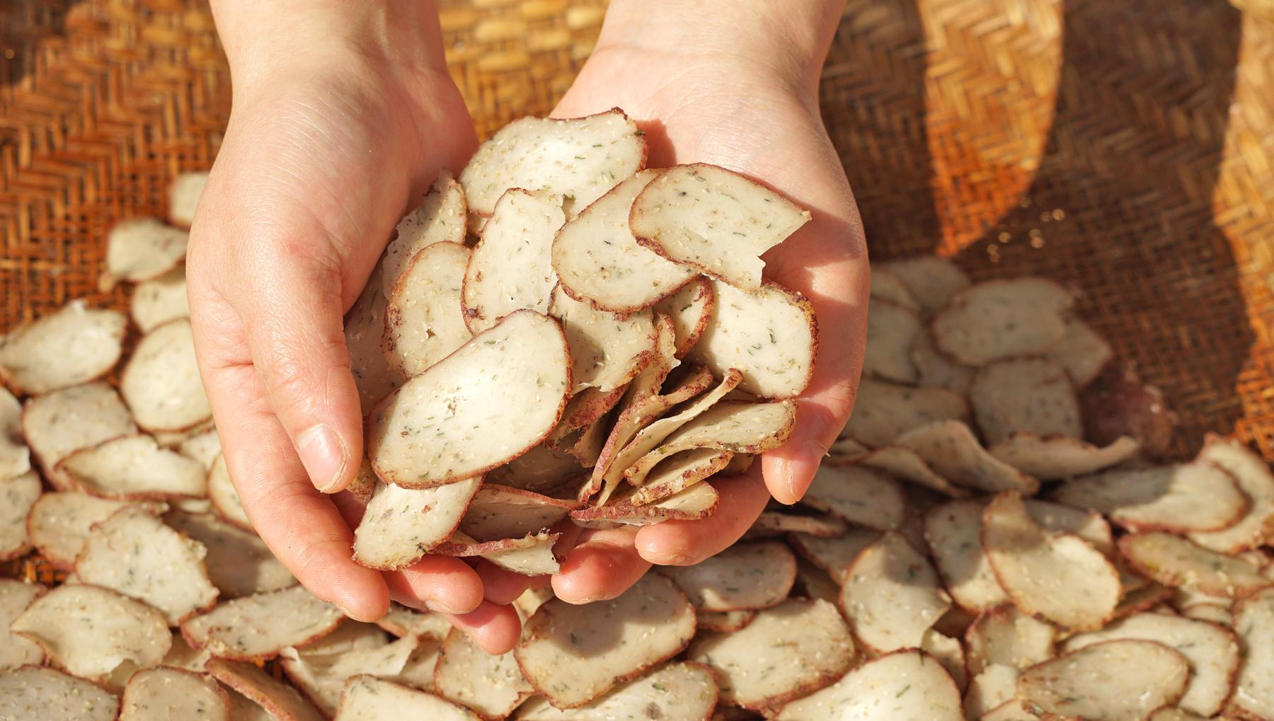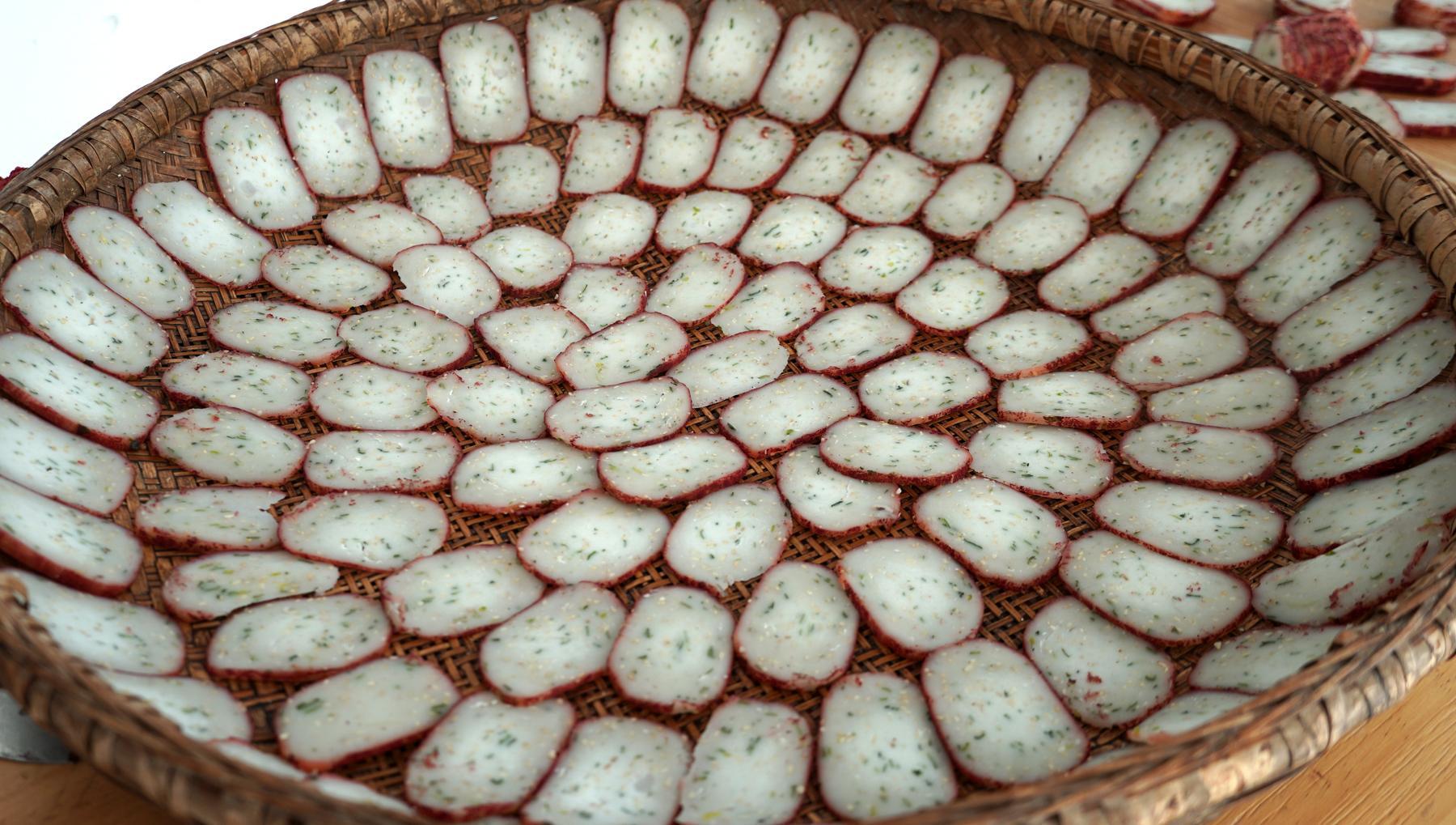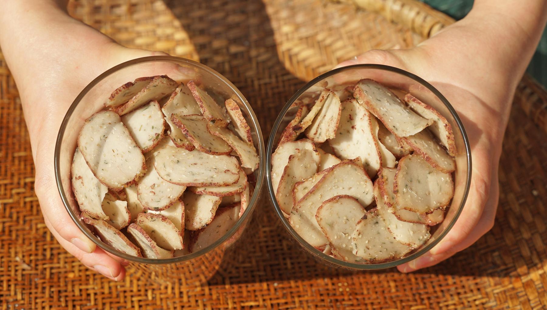 芋頭是芋蘭片的主角,蒸熟後的芋頭搭配木薯粉,經過先煮後曬的製作,口感上瞬間就變了個花樣,喜歡喫甜口的可以放糖,喜歡喫鹹口的可以放蔥花,無論是哪一種口味,都是深受大家的喜愛,酥脆可口,越喫越香。