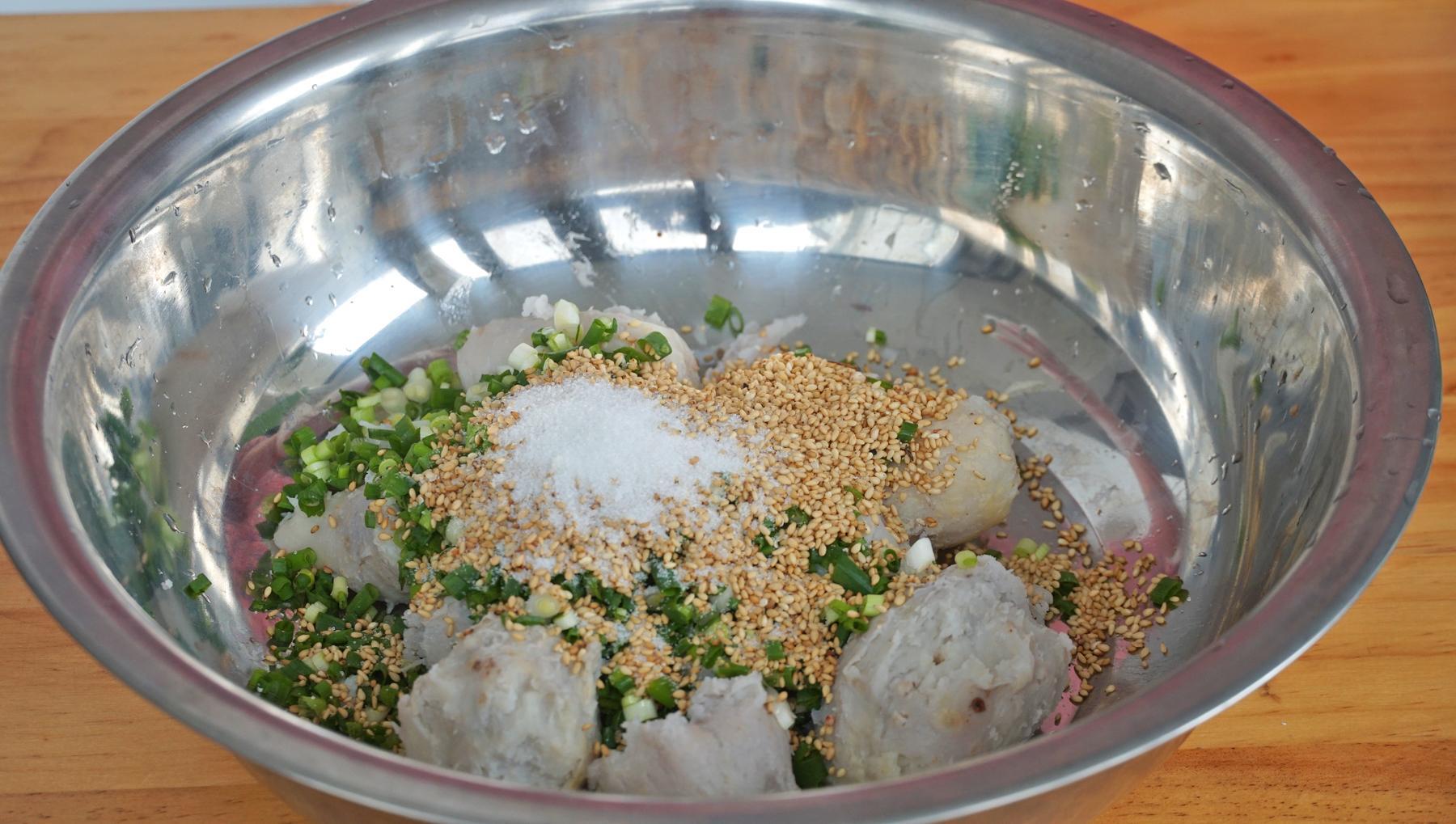 5、這時候芋頭也蒸熟了,取出來,趁熱剝皮,然後加白芝麻、蔥花、一勺鹽。