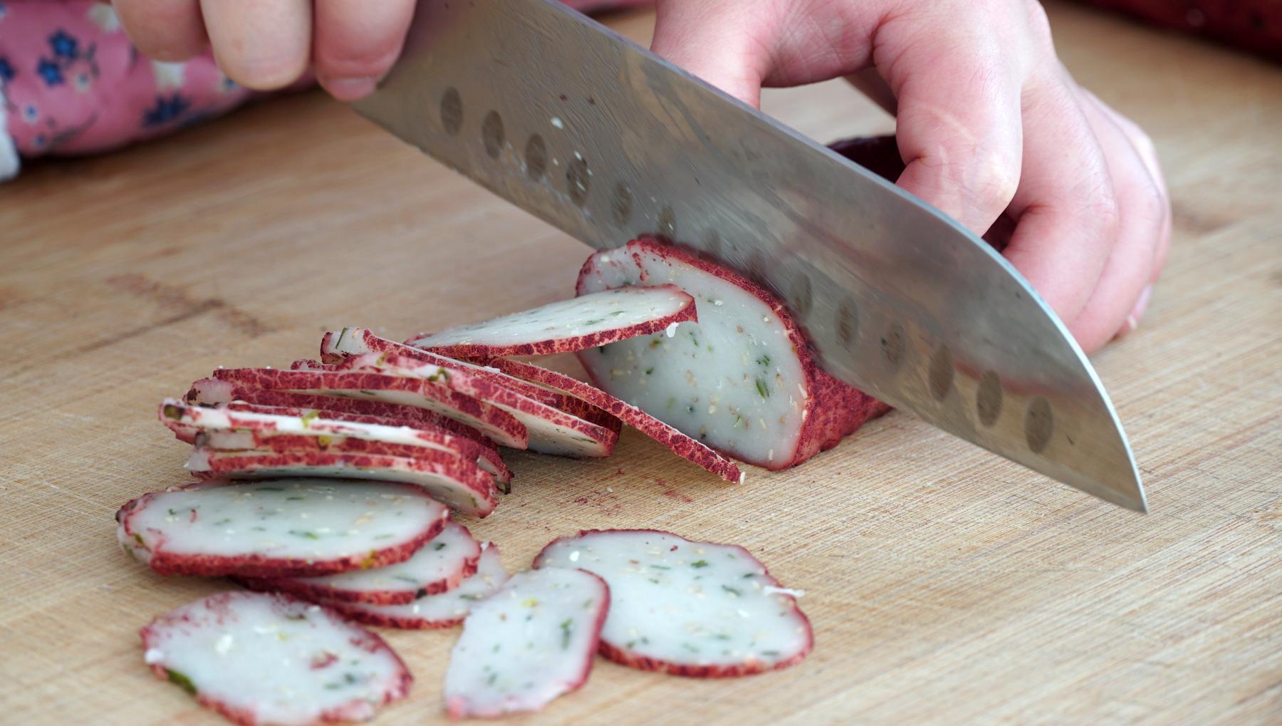 1、我這裏是放了一夜的狀態,摸起來有點硬就可以來切了,先切成片,儘量薄一點,不要太厚了。