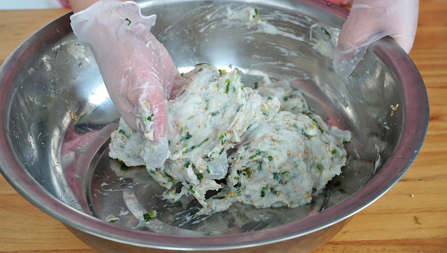 1、這時候再少量多次的加入木薯粉,覺得稀就再加點木薯粉,覺得幹不好揉就加清水,能揉成一個光滑的麪糰兒就可以。