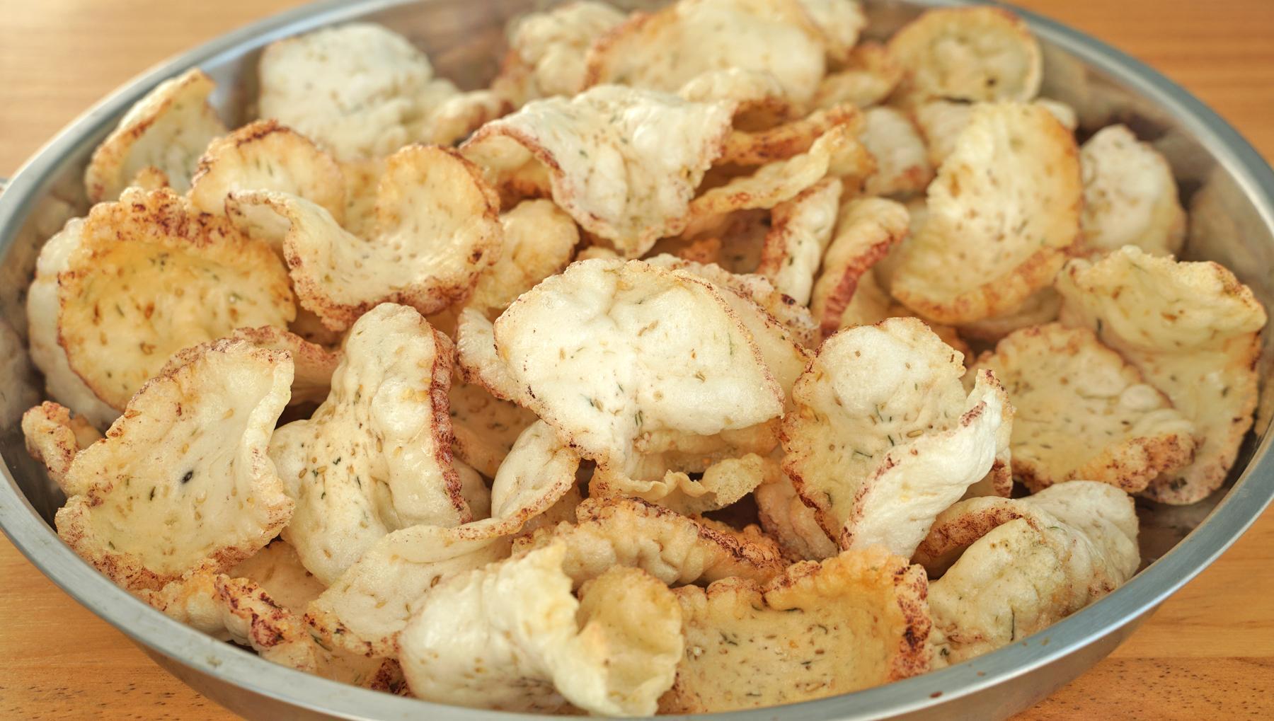 2、幾秒鐘就全部飄起來了,然後撈出來就可以開喫了。香酥可口,你們聽,真的是非常的脆。和薯片一樣好喫,但是又多了一份蔥香味。
