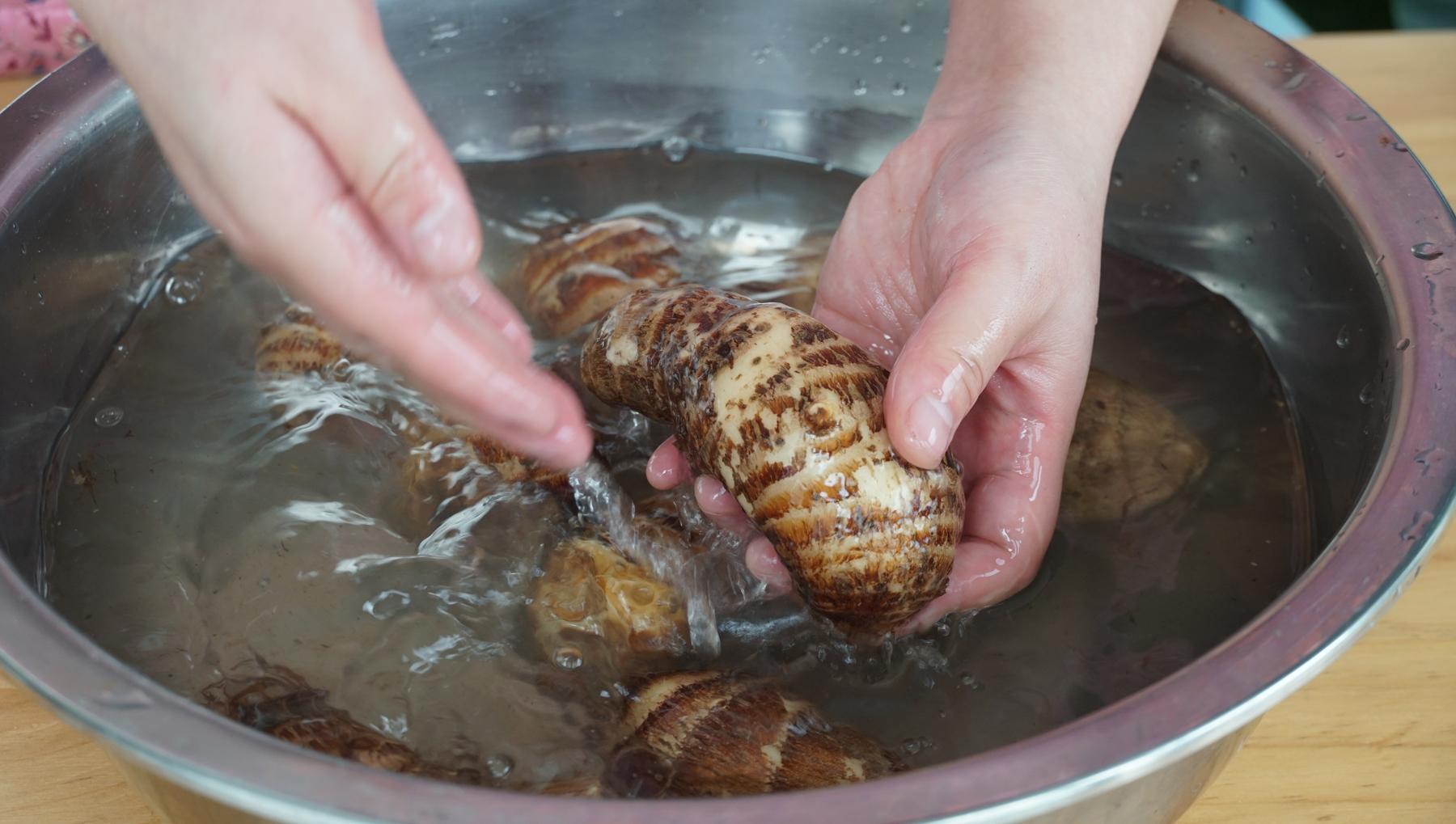 1、這裏是一斤半的芋頭,先洗乾淨,這裏的芋頭可以選擇小個頭的本地芋頭。