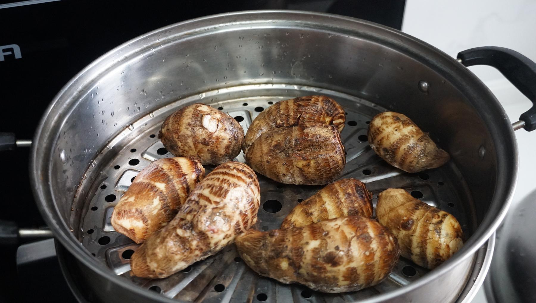 2、然後上鍋蒸熟,冷水上鍋蒸,水開計時,大火蒸20分鐘,把芋頭完全的蒸熟,蒸熟後可以用筷子插一下,能輕鬆插透就說明已經都蒸軟爛了。