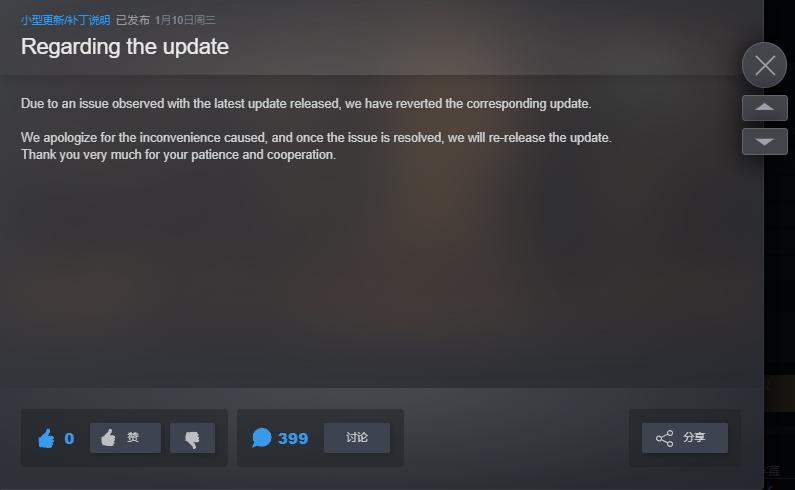 第二天,卡普空通過Steam發佈了一份簡短聲明,解釋說最近的一次更新已經回滾,對造成的不便表示道歉,但是“一旦問題得到解決,我們會重新發布更新”。這樣的回覆並無悔改之意,更不可能平息玩家們的怒火和差評轟炸。