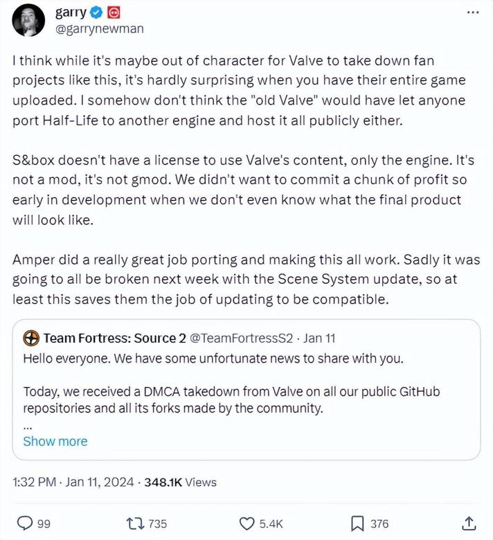 按照V社以往對於玩家社區的寬容,一次壓下兩部玩家作品看起來有些令人奇怪。Garry''s Mod遊戲作者Garry也在社交媒體上就此事發表了看法,首先《軍團要塞:起源2》本身幾乎是完全重製的遊戲,而V社的《軍團要塞2》還在運營,應該並不會放任該作品發佈。另外Amper Software方面也表示遊戲因爲各種原因,早在去年9月就陷入了停止開發的狀態,收到V社的DMCA通知只是“棺材上的最後一顆釘子”罷了。
