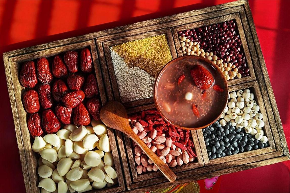 大米、糯米、小米等穀類;紅豆、綠豆、黃豆等豆類;花生、核桃、杏仁等堅果類;紅棗、桂圓、山藥等果蔬類;芡實、百合、枸杞等藥食類,有“五福俱全、人興財旺”的寓意。