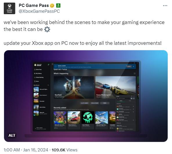 16日,PGP官方在X(推特)上提醒用戶更新Xbox客戶端,但沒有說明具體更新內容,只是配了一張客戶端的首頁圖。