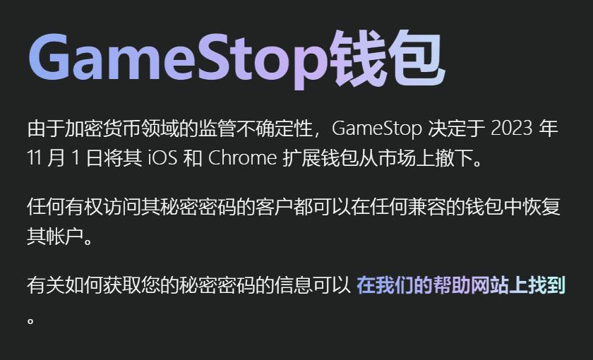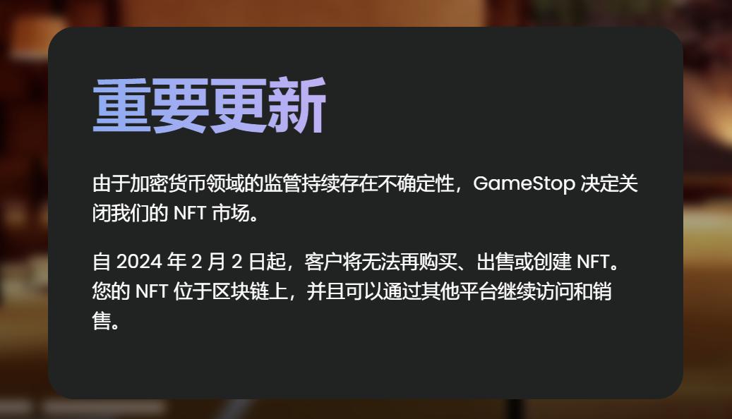 2022年5月份,北美知名遊戲零售商Gamestop宣佈建立自己的NFT市場,而僅18個月後他們的NFT網站便貼出了關停通告,理由是認爲加密領域的監管存在長期不確定性。