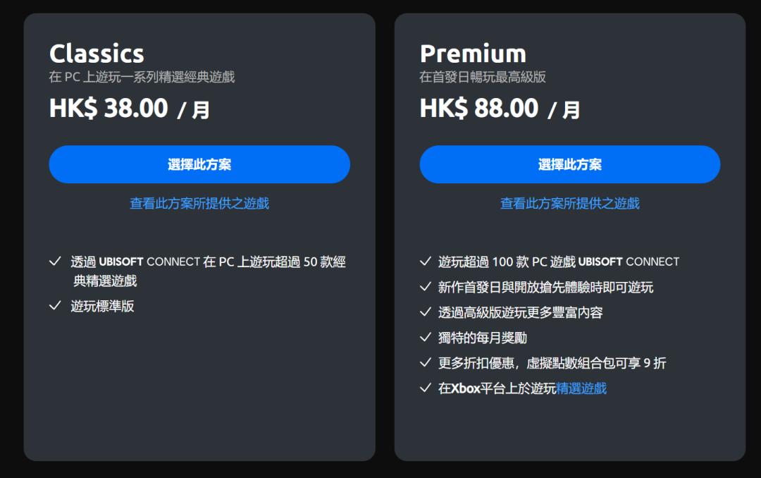育碧於15日調整了自家的Ubisoft+訂閱服務,將會員服務分爲了Classics和Premium兩個檔位,前者每月價格爲38港幣,後者則爲每月88港幣。