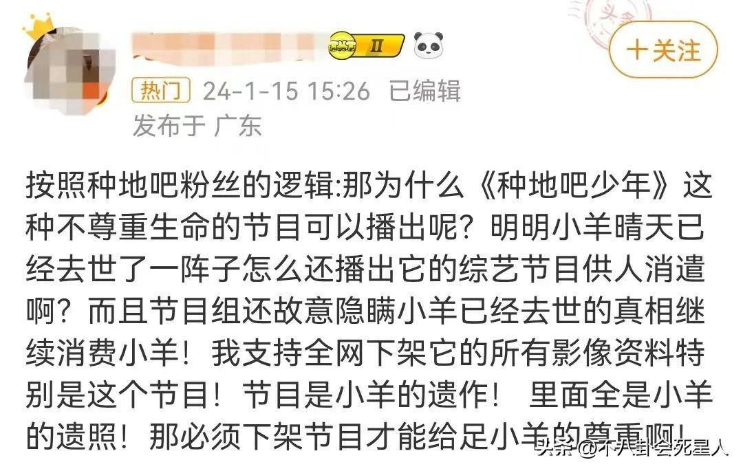 當時關於“晴天”的片段有半分鐘左右,有的粉絲並不知道那隻小羊已經去世,有的對此熟悉的粉絲則覺得是“夢幻聯動”,但是《種地吧少年》的粉絲卻非常不滿。