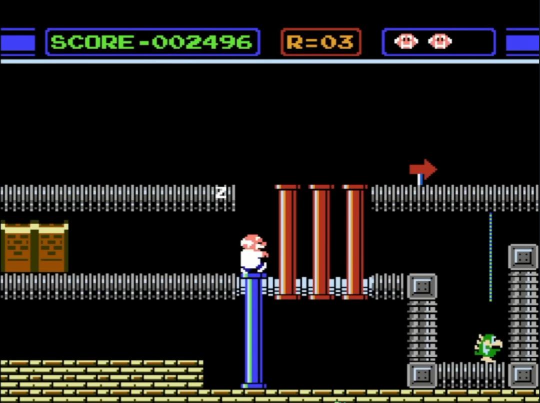 《Gyromite》的B模式,理論上只需要手柄上的A和B兩個按鍵就能暢玩。在遊戲中,一位夢遊的科學家會自動向右移動,而路徑上的管道和怪物會攔住去路。玩家需要及時按下按鈕,升高或降低管道,引導科學家穿過實驗室中的一個又一個關卡。