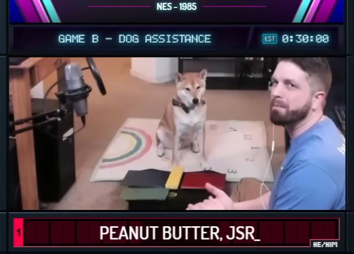 這隻柴犬叫做“花生醬”(Peanut Butter,PB),他的主人是JSR,也是一位速通玩家。他們兩個合作速通了NES遊戲《Gyromite》的B模式。