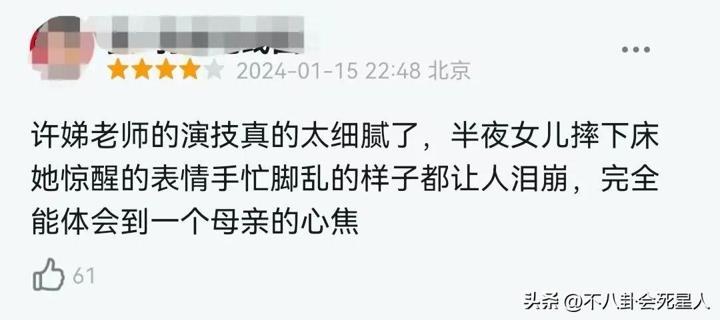 聽到女兒因爲幻肢疼而忍不住呻吟時,許娣將母親的那種慌張、心疼表現得淋漓盡致,她一下子衝過去,抱起自己的女兒,嘴裏不住地詢問着“哪兒疼,哪兒疼啊”。