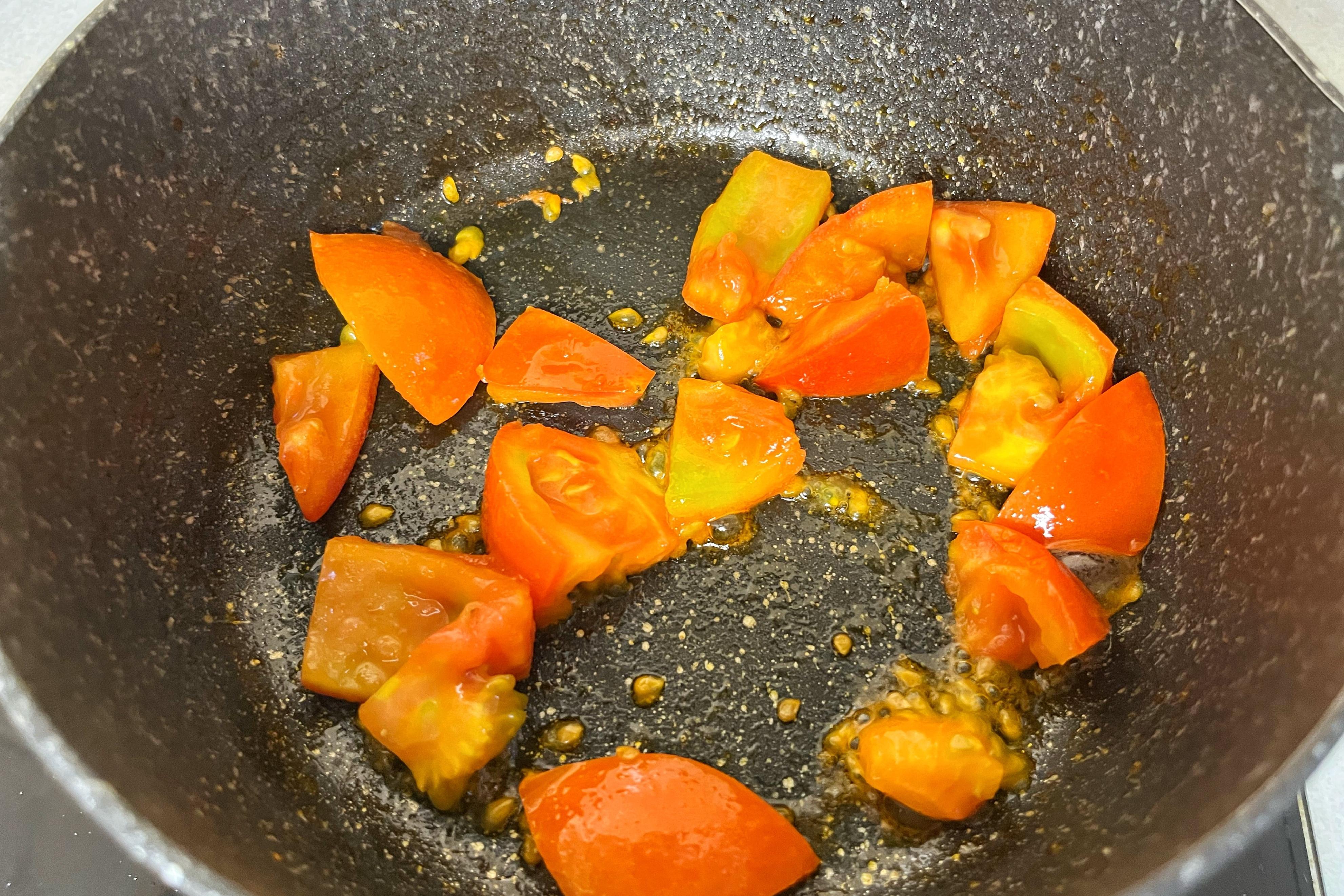 2、鍋中加油,下些蒜末炒香,倒入西紅柿,大火翻炒出汁;